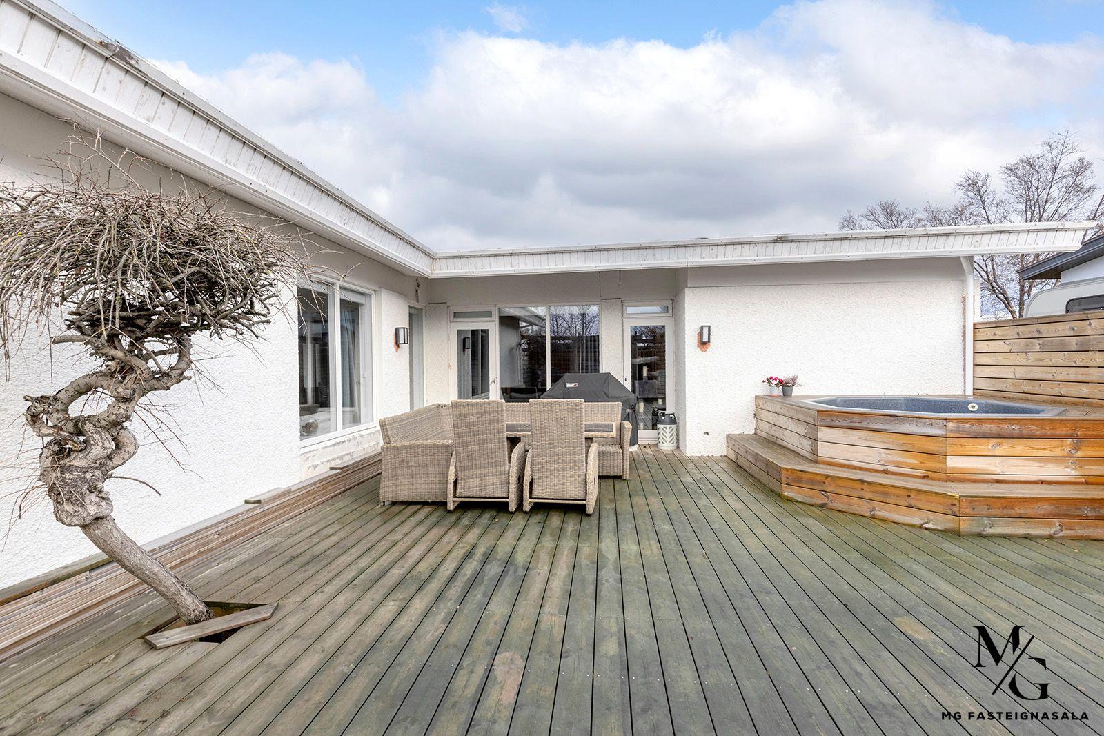 Efri hæð hússins skiptist í forstofu, stofu, borðstofu, eldhús, þrjú svefnherbergi (fjögur skv. teikningu), sjónvarpsherbergi, baðherbergi, gufubað, gestasnyrtingu, þvottahús, búr og bílskúr. Timburverönd með heitum potti, gengið út frá sjónvarpsherbergi. Annað útgengi frá svefnherbergisgangi.