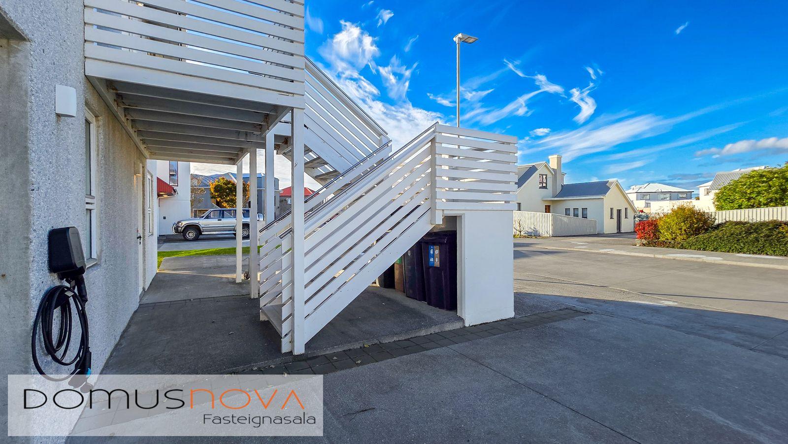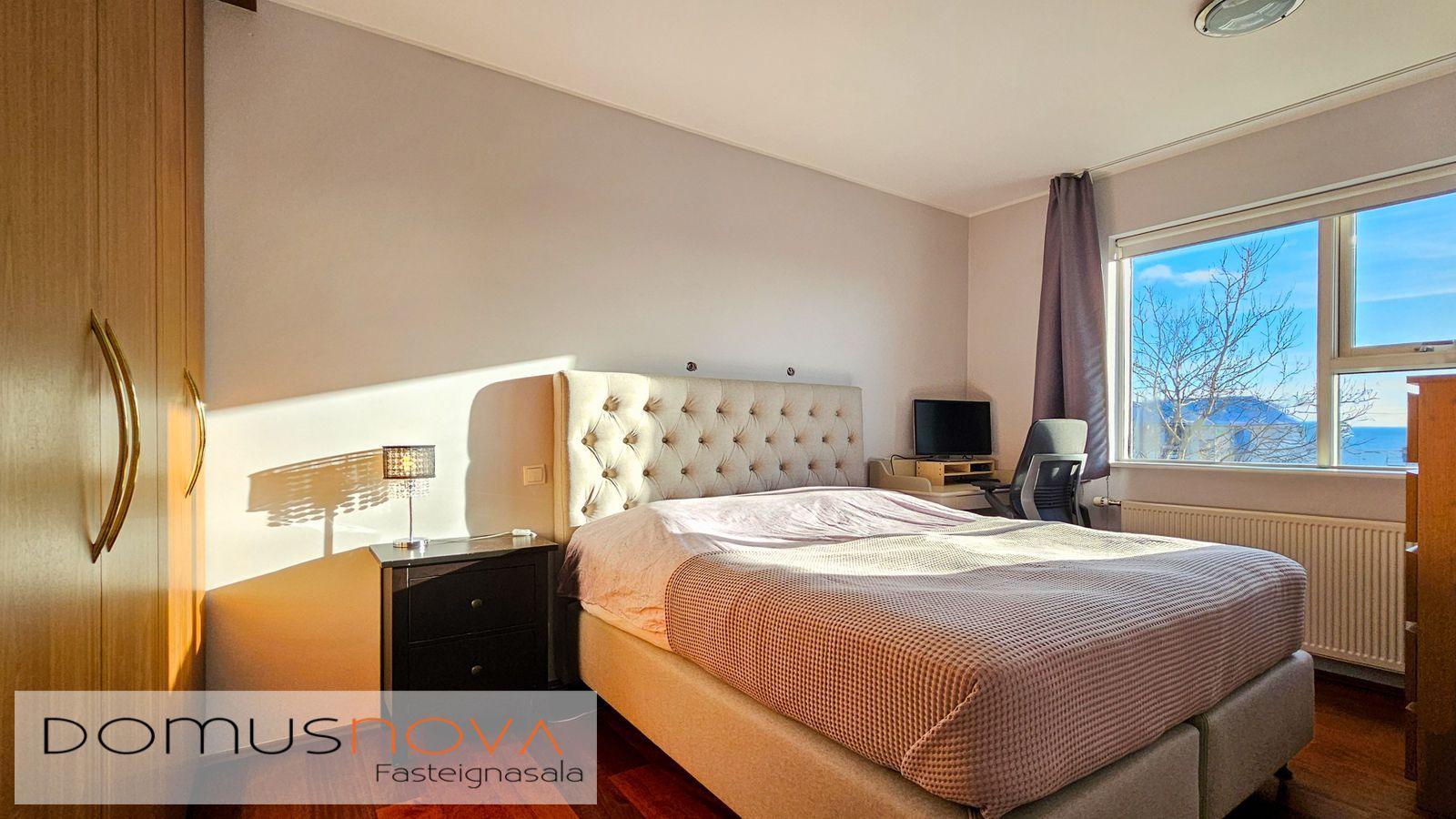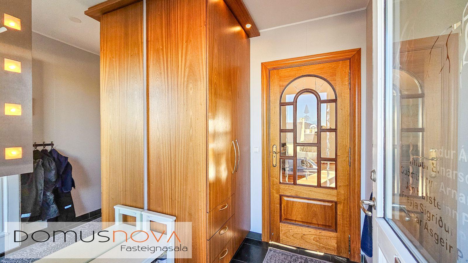 Bílskúr: Skilrúmi/geymsla er innst í bílskúr, þaðan er útgengt út í garð. Hiti, rafmagn og rennandi vatn. Rafknúin bílskúrshurð með fjarstýringu. Flísar á gólfi.