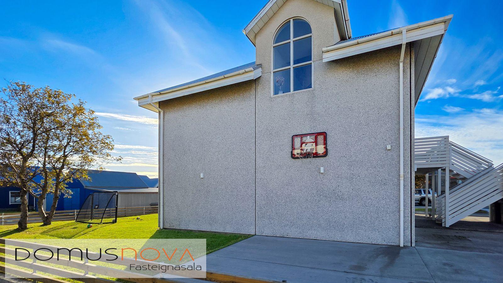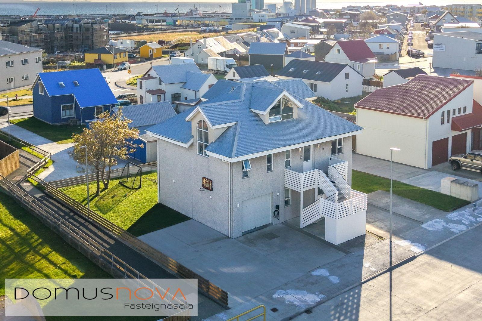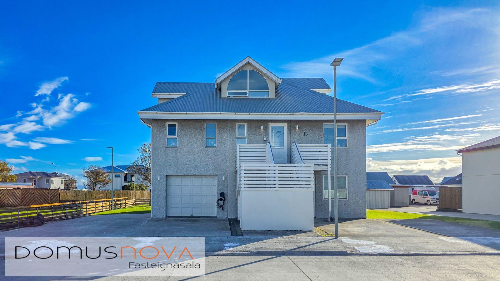 Háholt 16 er tvílyft hús með hluta íbúðar í risi, byggt á steyptum grunn og steypt upp með forsteyptum einingum árið 2000. Útitröppur og svalir til suðurs eru úr gagnvörðu timbri. Í húsinu eru tveir eignarhlutar, hvor með sérinngang. Eignin er að hluta til undir súð og gólfflötur því stærri en birtir fm. segja til um. Íbúðarrými eignar er 129,7 fm. semskiptist í anddyri, eldhús, borðstofu og stofu þaðsn sem útgengt er á suðursvalir til, svefnherbergi, gestasalerni og þvottahús. Í risi eru tvö svefnherbergi, baðherbergi og setustofa. Fallegir bogadregnir gluggar á efri hæð íbúðar. Bílskúr er 34,9 fm. með rafknúinni bílskurðshurð. Góð aðkoma og næg bílastæði fyrir framan og við hlið bílskúr. Sameiginleg geymsla er undir útitröppum. Hleðslustöð fyrir rafmagnsbíl.