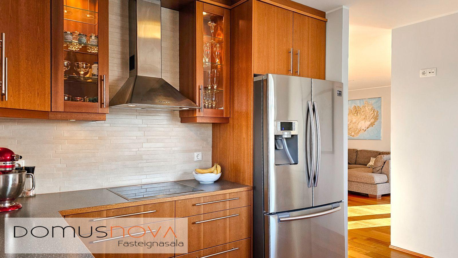 Eldhús: U-laga maghogný eldhúsinnrétting með efri og neðri skápum. Helluborð, blásturofn og gufuofn í vinnuhæð, gert ráð fyrir uppþvottavél. Góð vinnuaðstaða og mikið skápapláss. Viðarparket á gólfi.