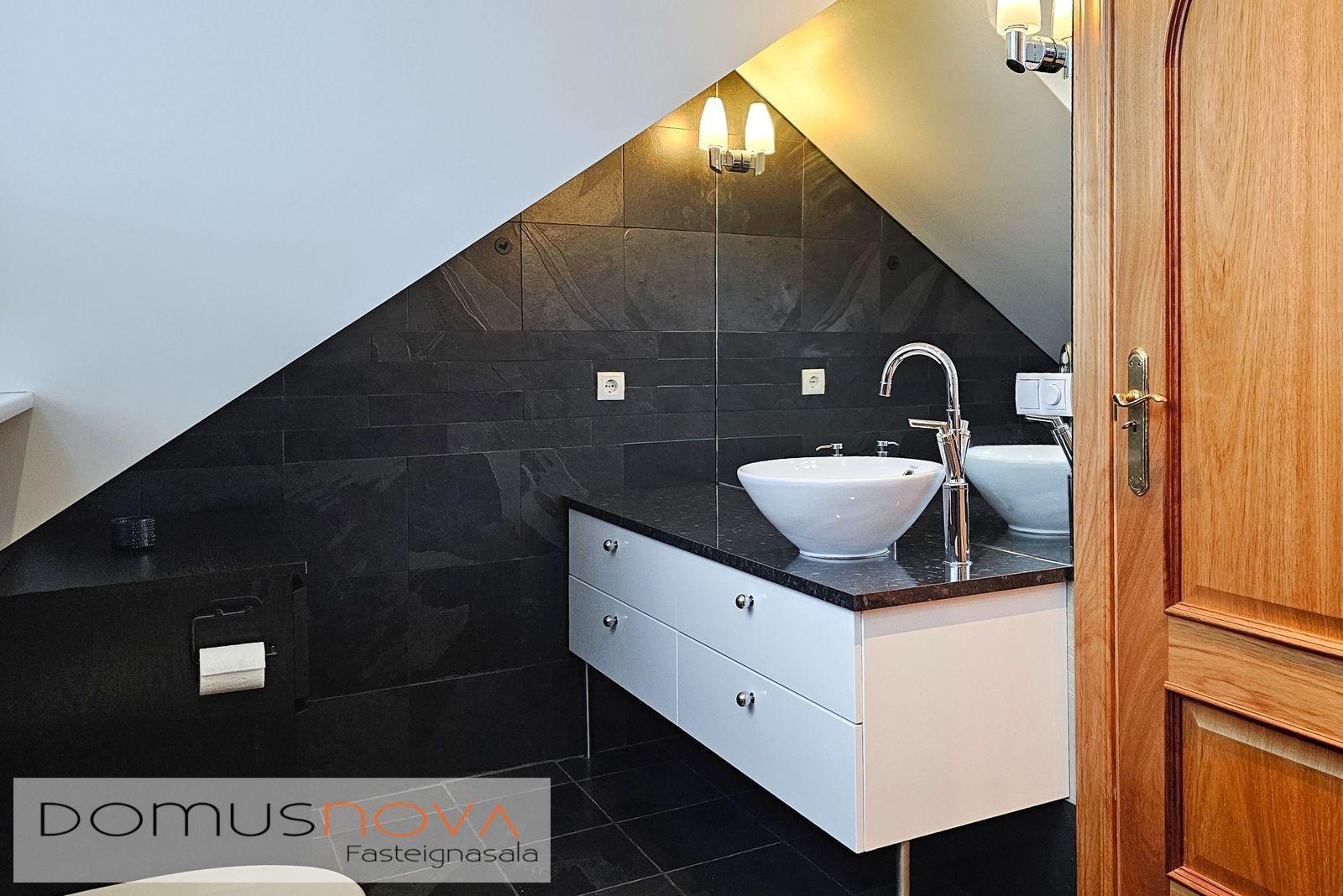 Baðherbergi: Hvít innrétting, dökk borðplata með handlaug ofan á borði og sturtuklefi. Veggflísar og flísar á gólfi.