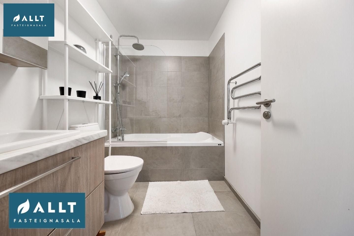 Baðherbergi: Baðkar með sturtu. Innrétting með handlaug og handklæðaofn. Gólfið og baðkar er flísalagt með gráum flísum.