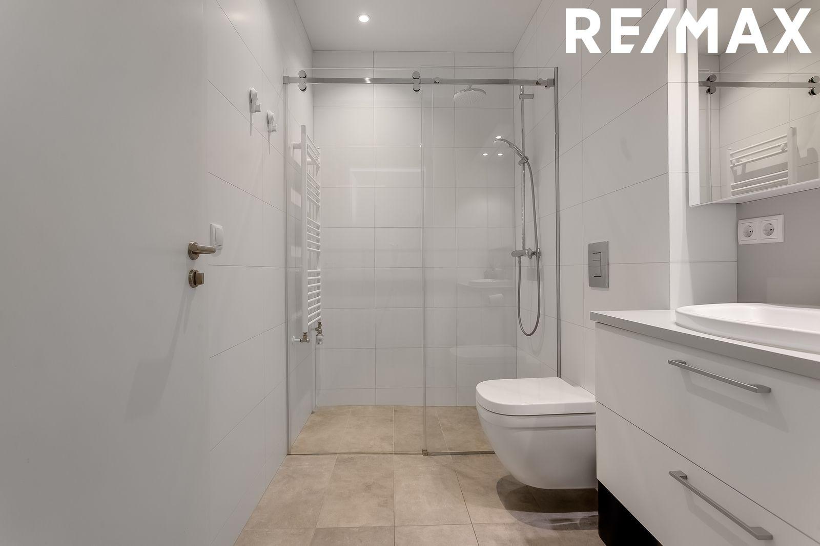 Baðherbergi er með skápaeiningu undir handlaug og veggfestum speglaskáp með ljósi. Þreplaus sturta með gleri, handklæðaofn og upphengt salerni. Ljósgráar gólfflísar og hvítar upp veggi. Inn af baðherbergi er þvottahús.