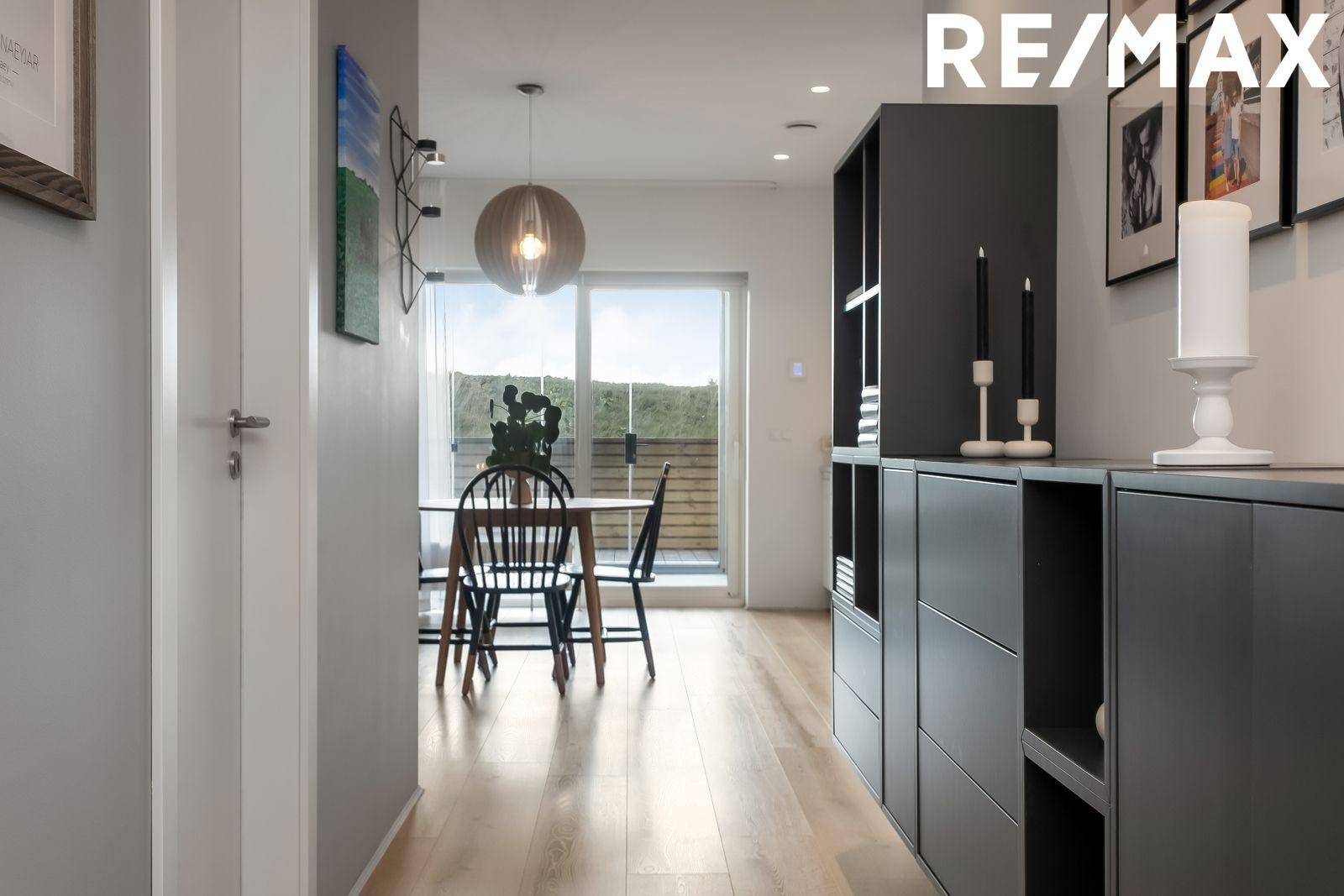 lyftu. Innan íbúðar er komið inn á parketlagt forstofuhol með fjórföldum hvítum fataskáp sem nær upp í loft.
