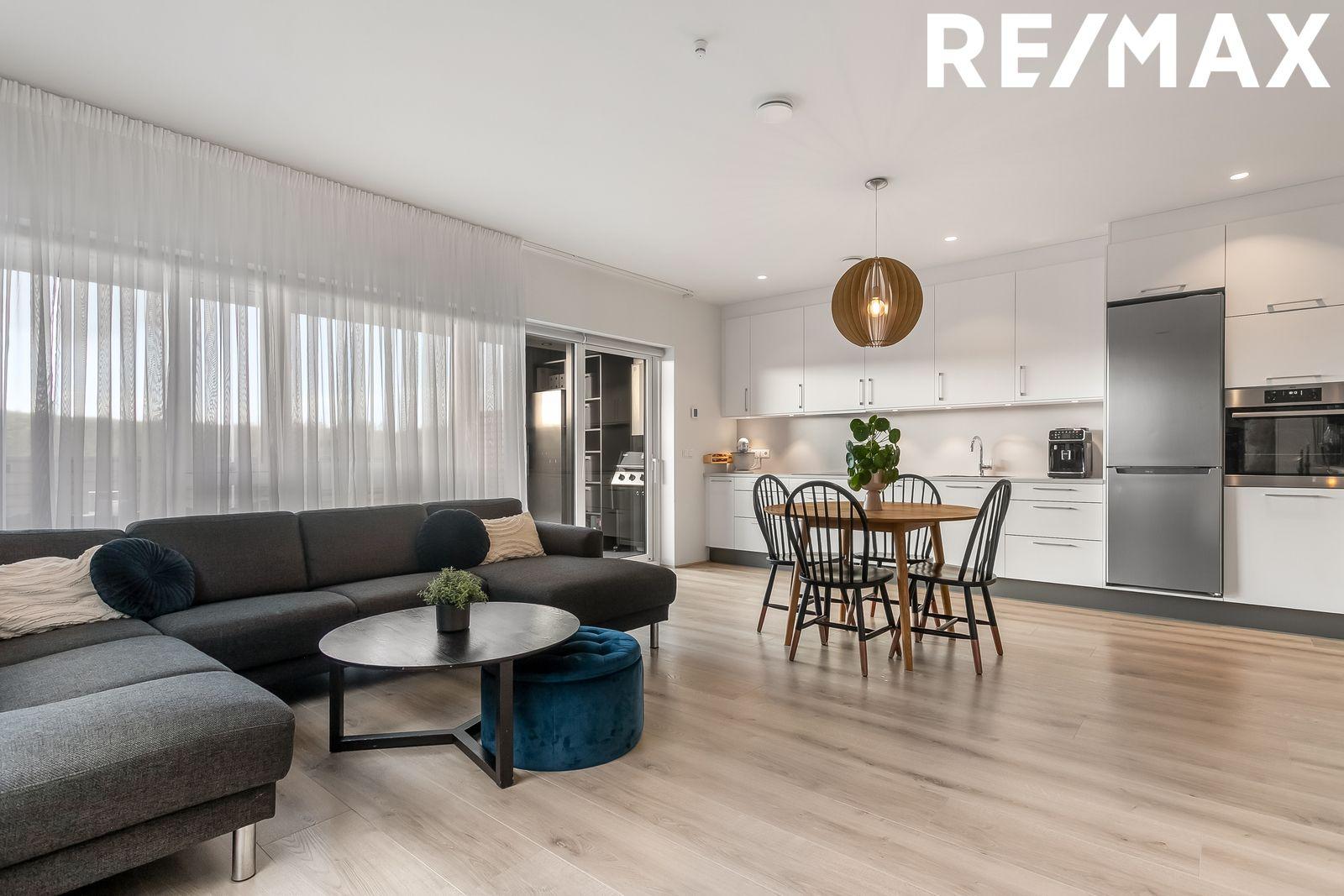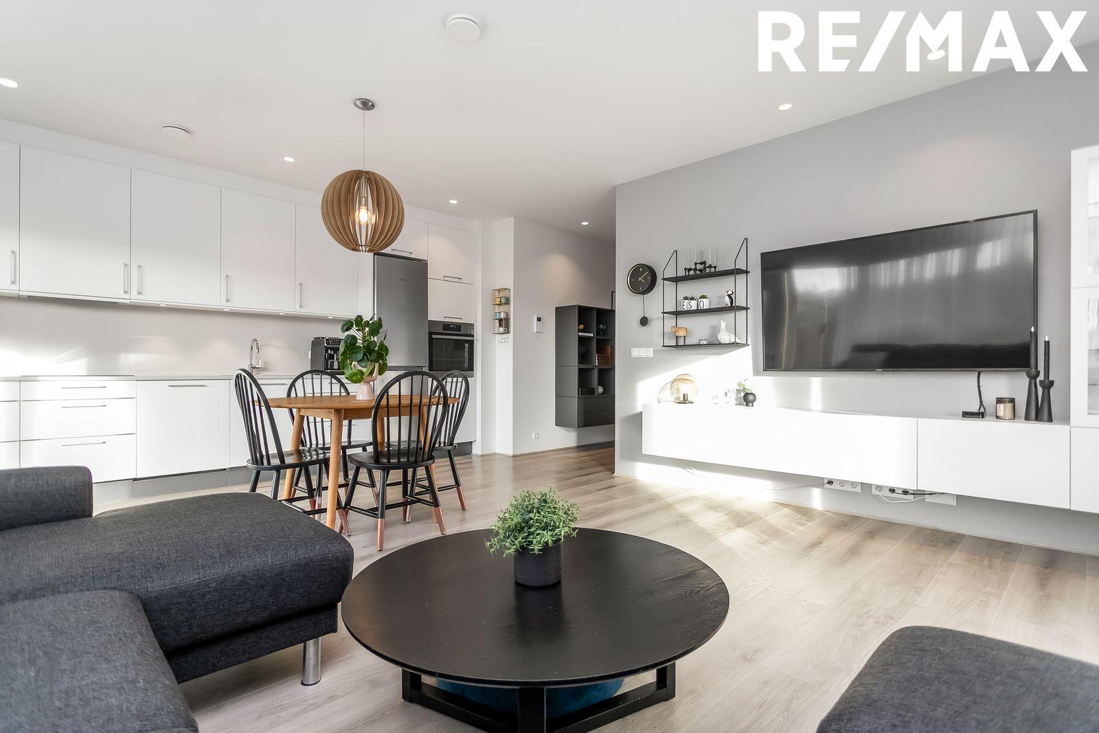 Stofa er björt með gluggum á tvo vegu. Innbyggð lýsing í lofti stofurýmis og gangs. Út frá stofu og eldhúsi er gengið út á stóra viðarverönd með skjólgirðingu. Gengið er um rennihurð og stækkar því pallurinn verulega stofurýmið. Parket á gólfi stofu.