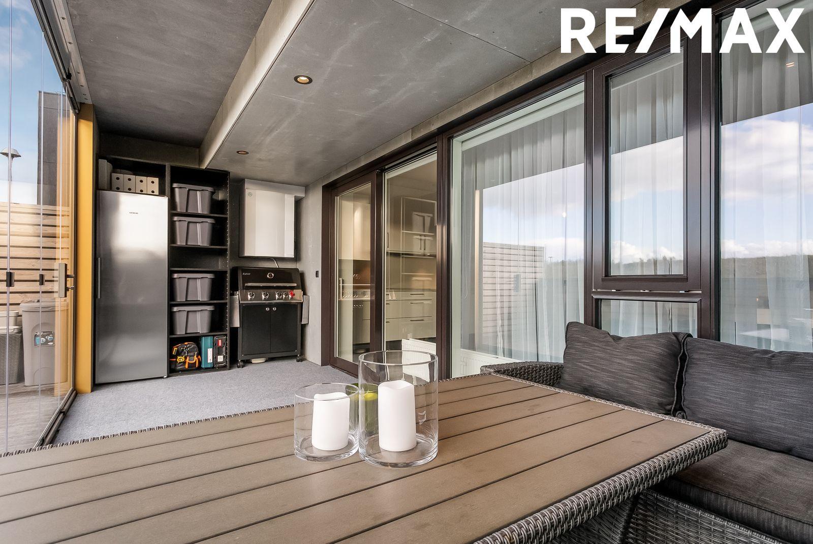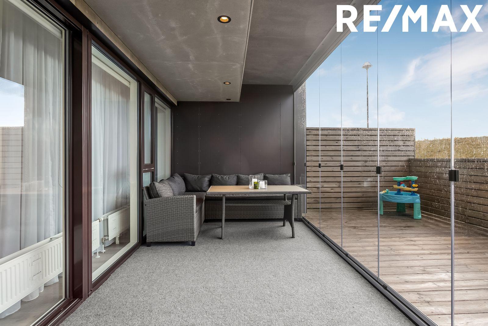 Viðarverönd með skjólgirðingu er um 30 m2 að stærð og er sérafnotareitur íbúðar. Um helmingjur hans er lokaður af með nýrri svalarlokun. Rafmagnstengi er til staðar til að bæta við hitara. Sólar nýtur við undir hádegi og fram á kvöld. Aftan við hús er grassvæði og göngustígar.