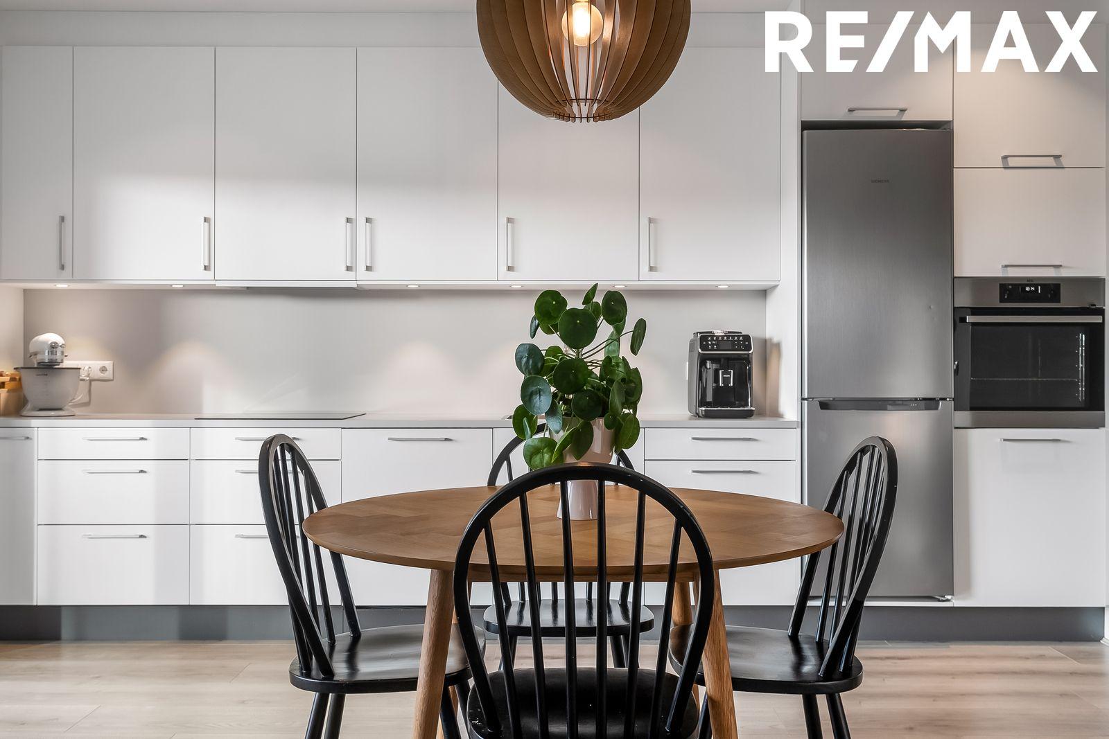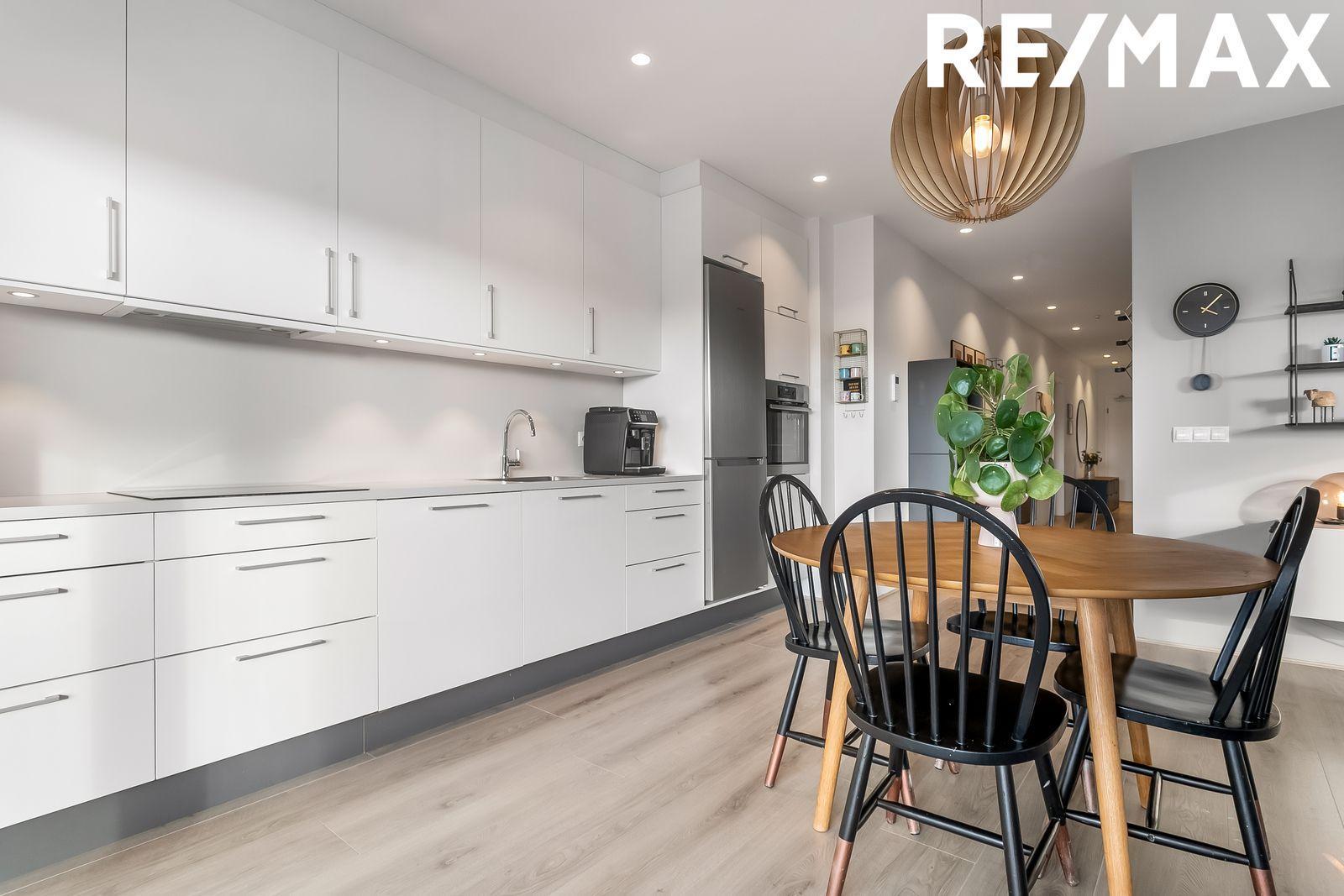 Eldhús er með hvítri innréttingu á einum vegg. Blástursofn, helluborð og gufugleypir eru AEG. Innfelld uppþvottavél. Stæði er fyrir ísskáp í innréttingu. Mjög gott skápapláss. Blöndunartæki eru Grohe. Parket á gólfi.