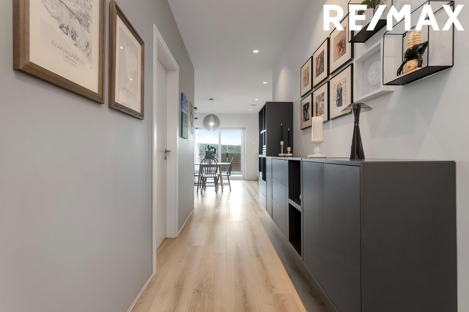 Allar innréttingar íbúðar eru frá Axis. Gangur í gegnum íbúðina er rúmgóður og nýtist því vel fyrir hirslur.