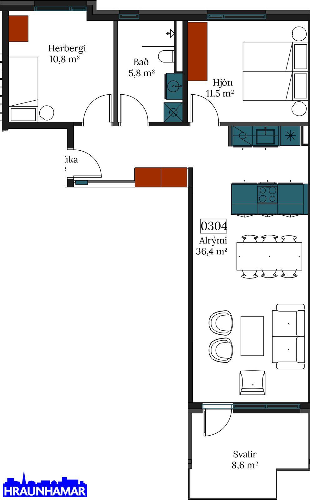 Íbúð 304 er þriggja herbergja íbúð, skráð 81,1 fermetrar með geymslu. Auk þess fylgir stæði með í lokaðri bílageymslu. Íbúðin afhendist fullbúin með gólfefnum.