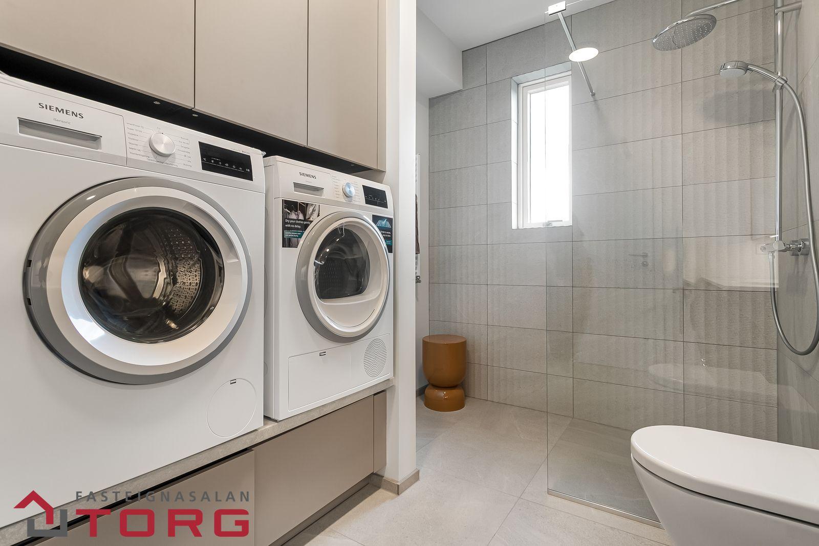 Innanhússfrágangur Gólfefni: Baðherbergi og þvottahús flísalögð, annars afhent án gólfefna.
