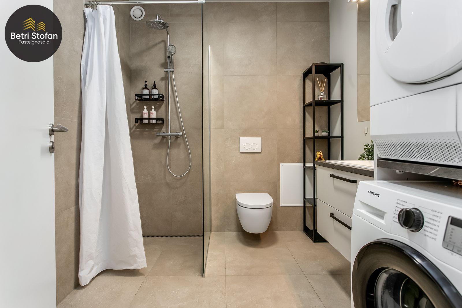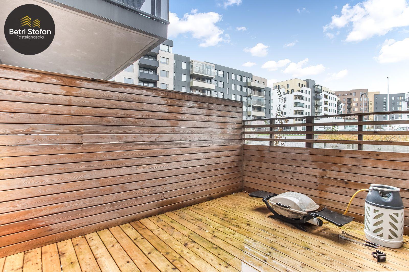 Komið er inn í rúmgóða forstofu með fataskáp. Baðherbergið er með flísum á gólfi og hluta veggja. Þar er falleg innrétting, upphengt salerni og sturta. Tengi er fyrir þvottavél á baðherberginu. Stofan er góð og björt, með útgengi á góða verönd með skjólveggjum. Svefnherbergið er rúmgott með stórum fastaskaáp. Eldhúsið er með fallegri innréttingu, skápapláss er ágætt og vinnuaðstaða fín. Gott pláss er fyrir borðstofuborð á milli eldhúss og stofu. Gólfefni eru parket og flísar.