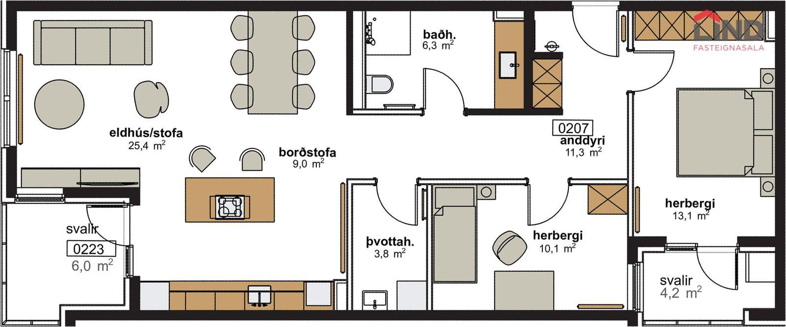 Íbúð 207 er Þriggja herbergja með þvottahúsi og bílastæði í kjallara.
