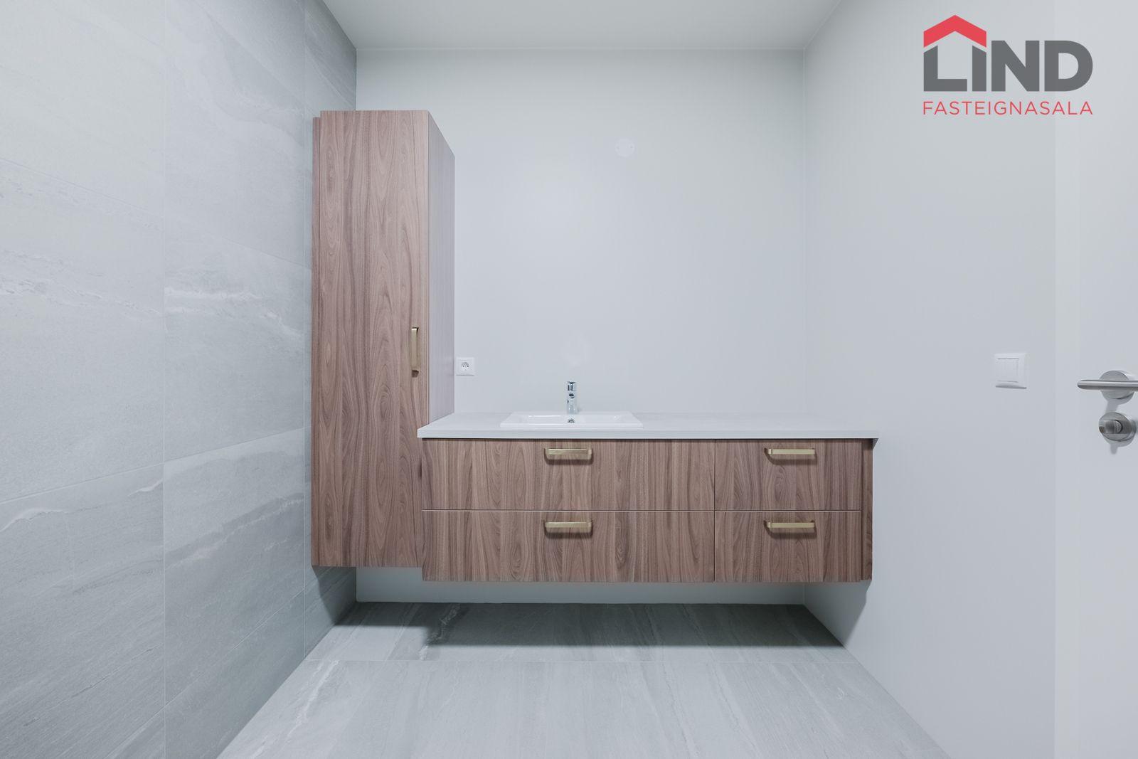 Baðherbergi: Baðinnrétting kemur frá Axis. Hreinlætistæki og handklæðaofn eru frá Byko. Salernið er upphengt og innbyggt. Hitastýrð blöndunartæki verða við sturtu. Gólf eru flísalögð og veggir að hluta upp í loft