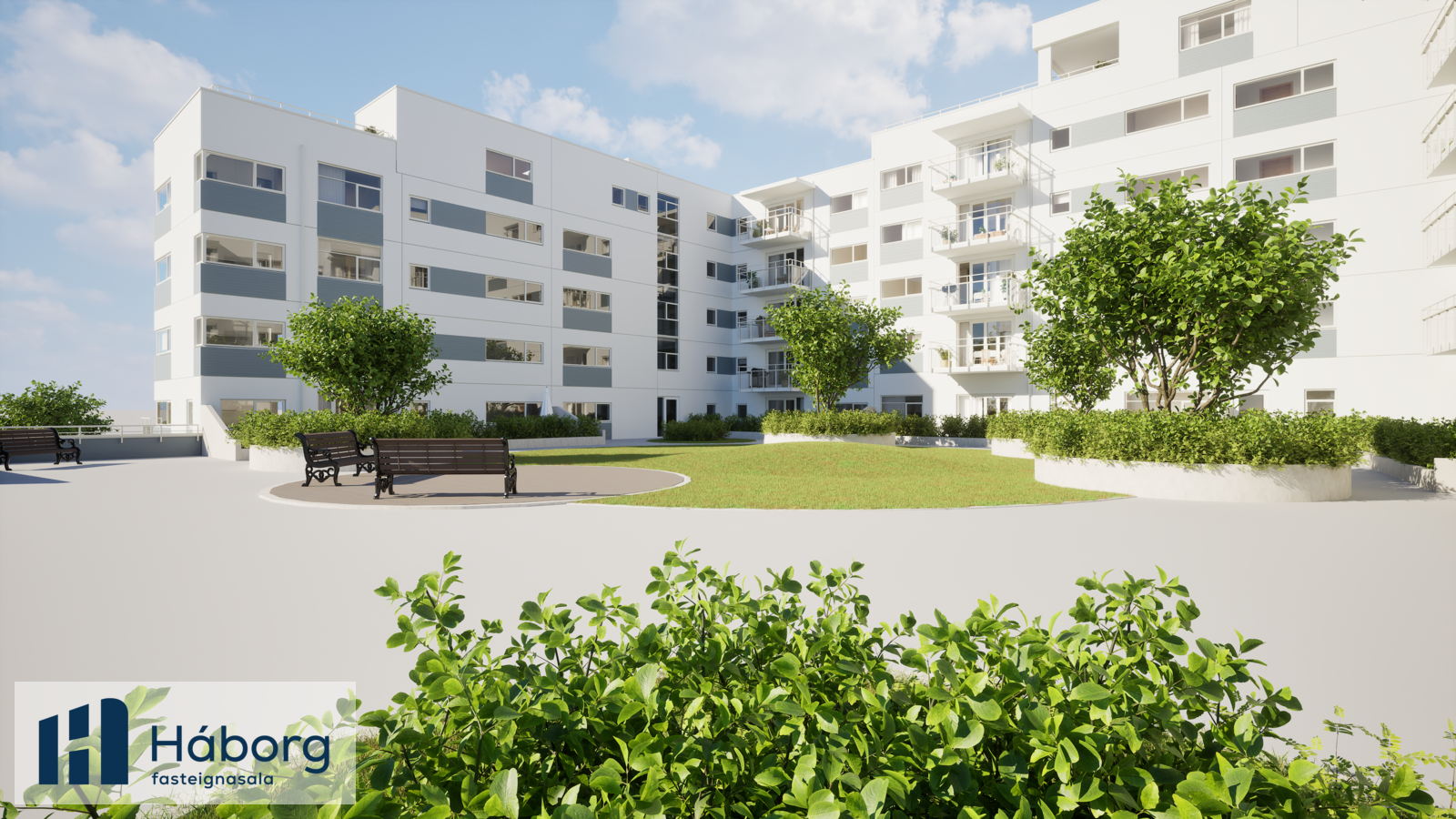 Inngarðurinn: er bjartur og fagur. Gangstéttar eru hellulagðar eða steyptar með innbyggðum hitalögnum, sem tryggir öryggi á veturna. Grassvæði verða klædd gerfigrasi og því græn allt árið. Hægt verður að setja upp leiksvæði barna í þessu skemmtilega rými.