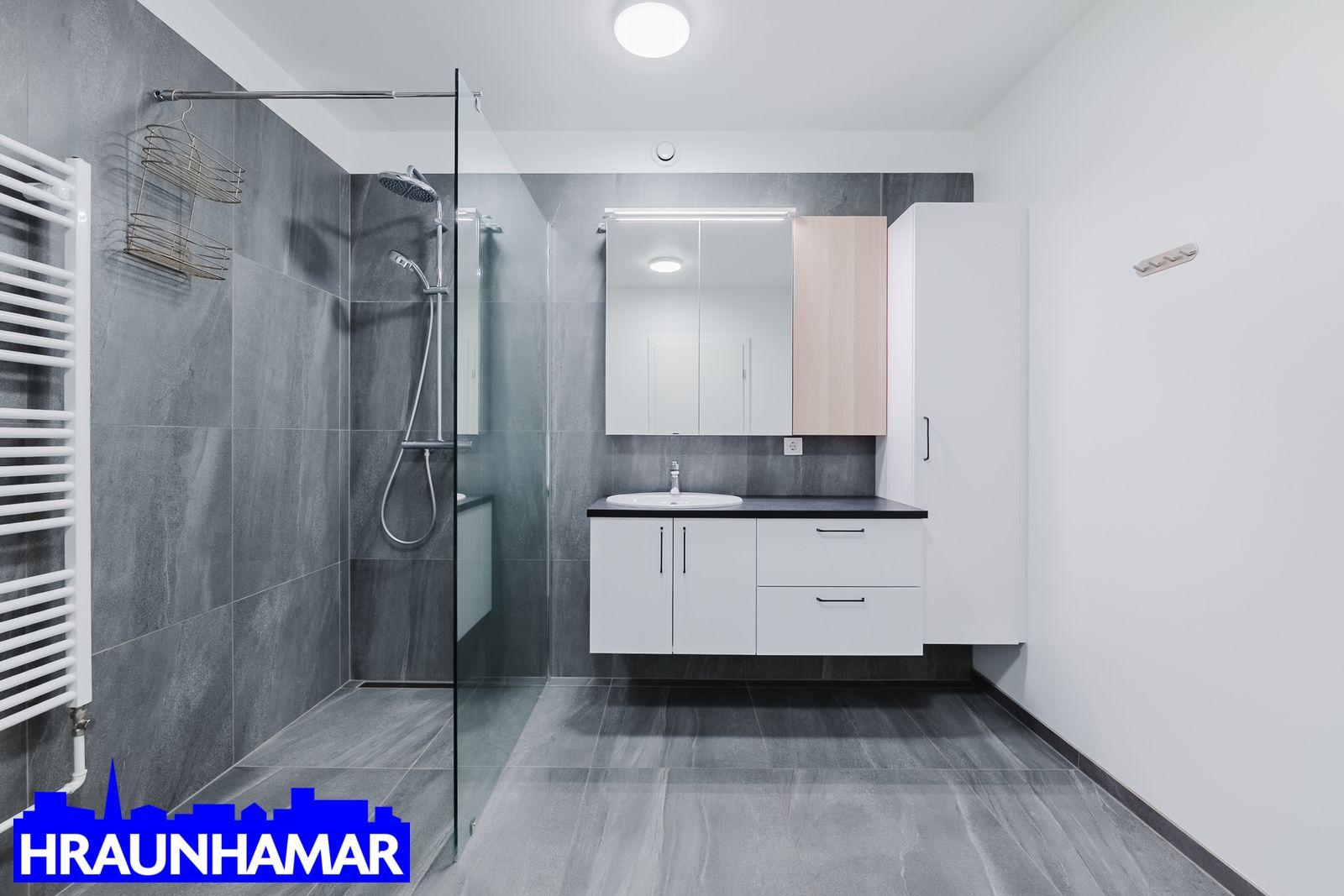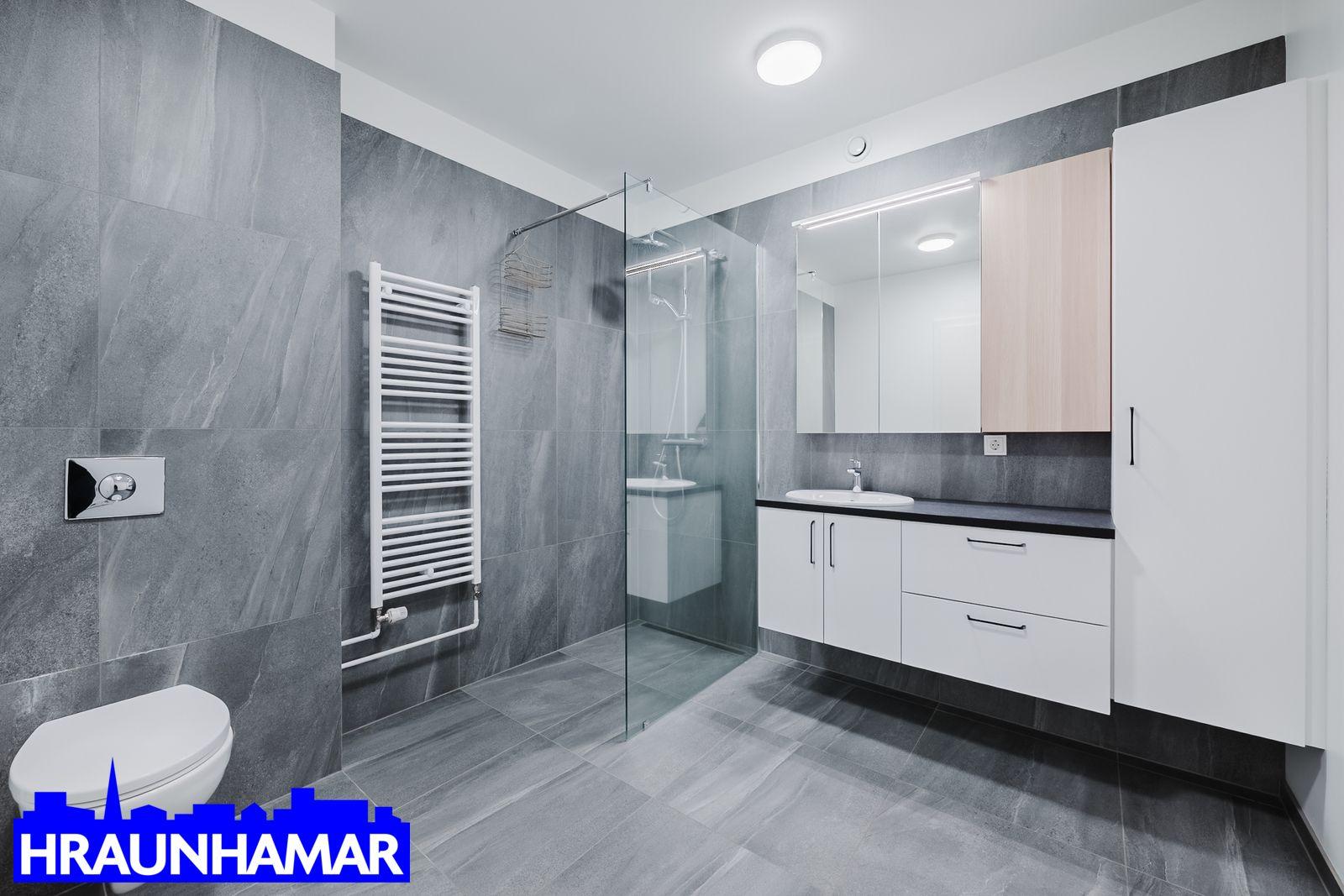 baðherbergi flísalagt í hólf og gólf, hvít innrétting, fín sturtuaðstaða, tengi fyrir