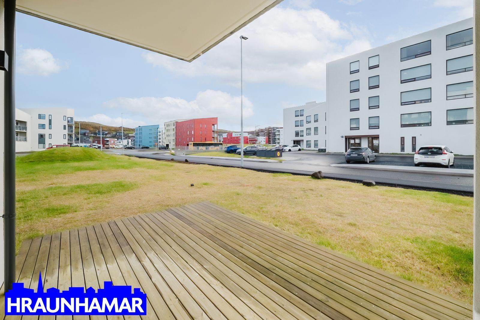 Hraunhamar fasteignasala kynnir: Afar bjarta, fallega og rúmgóða 116,4 fm nýlega 4ra herbergja endaíbúð á jarðhæð með verönd, í góðu nýlegu fjölbýli í Skarðshlíðinni Hfj. Húsið er næsta hús við Skarðshlíðarskólann og er því örstutt í skóla og leikskóla. Hagstætt verð ! Afar góð staðsetning í hverfinu, suðurverönd, Laus strax!