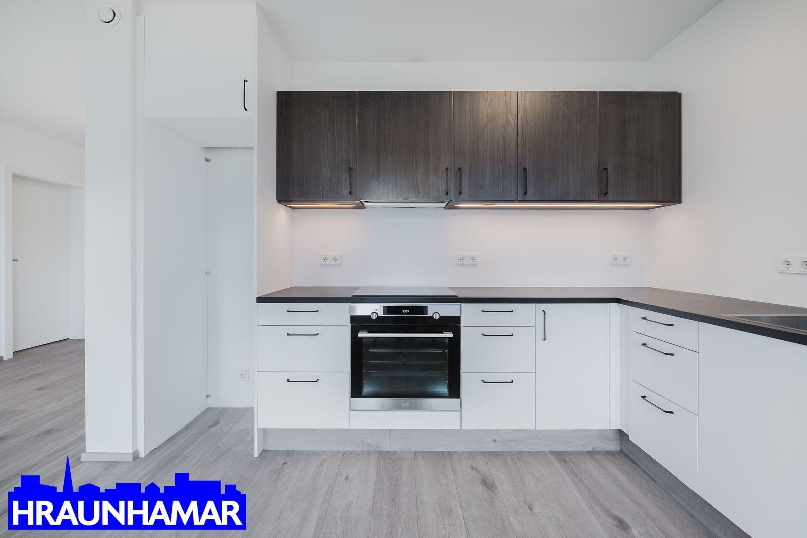 eldhús sem er opið inn í björt stofurýmin, hvít innrétting og tæki frá Ormsson. Við eldhús er síðan rúmgóð björt