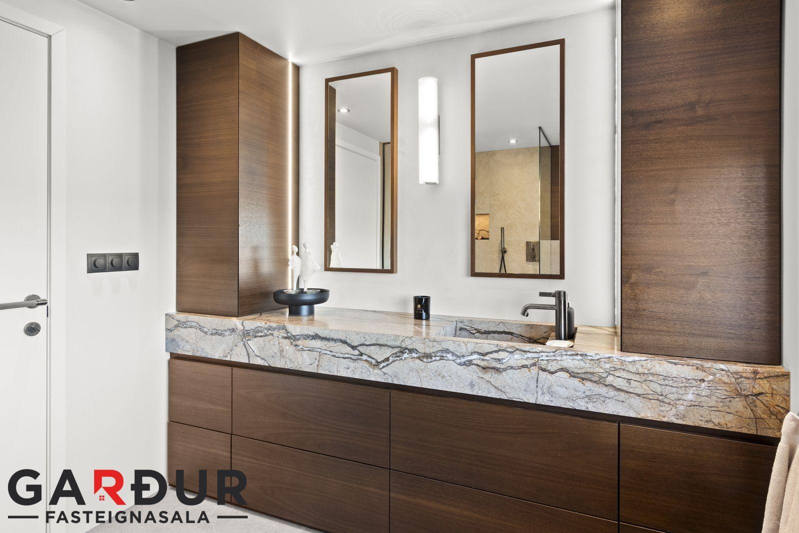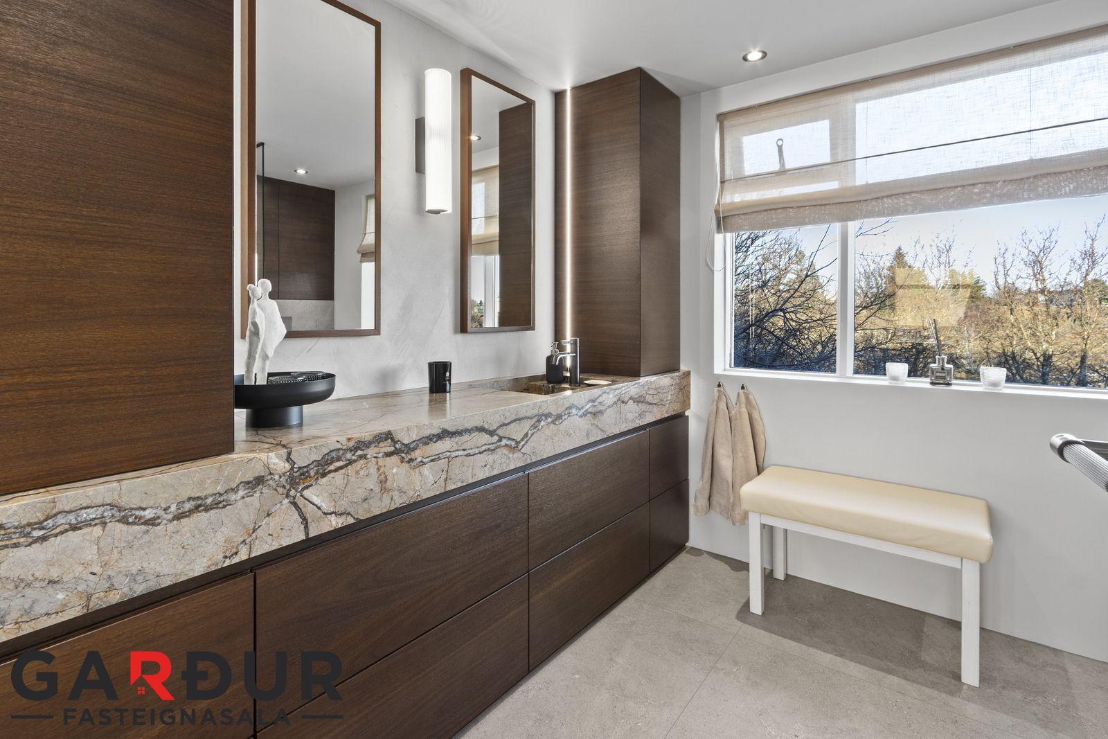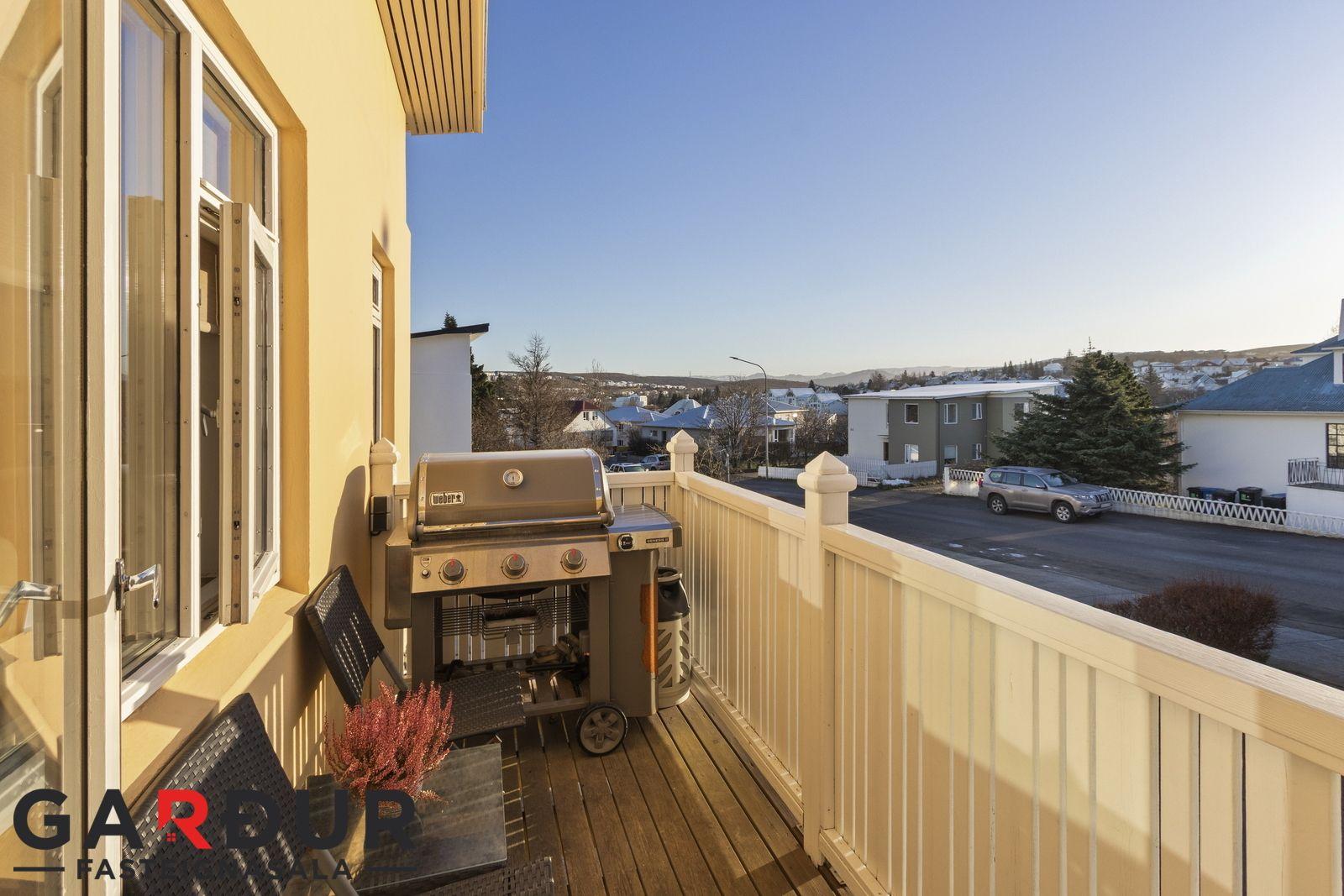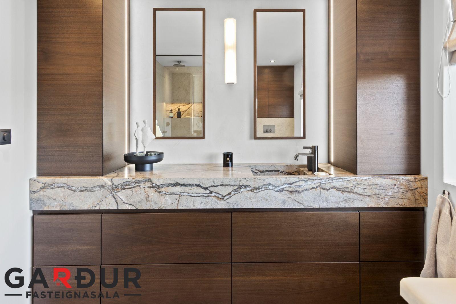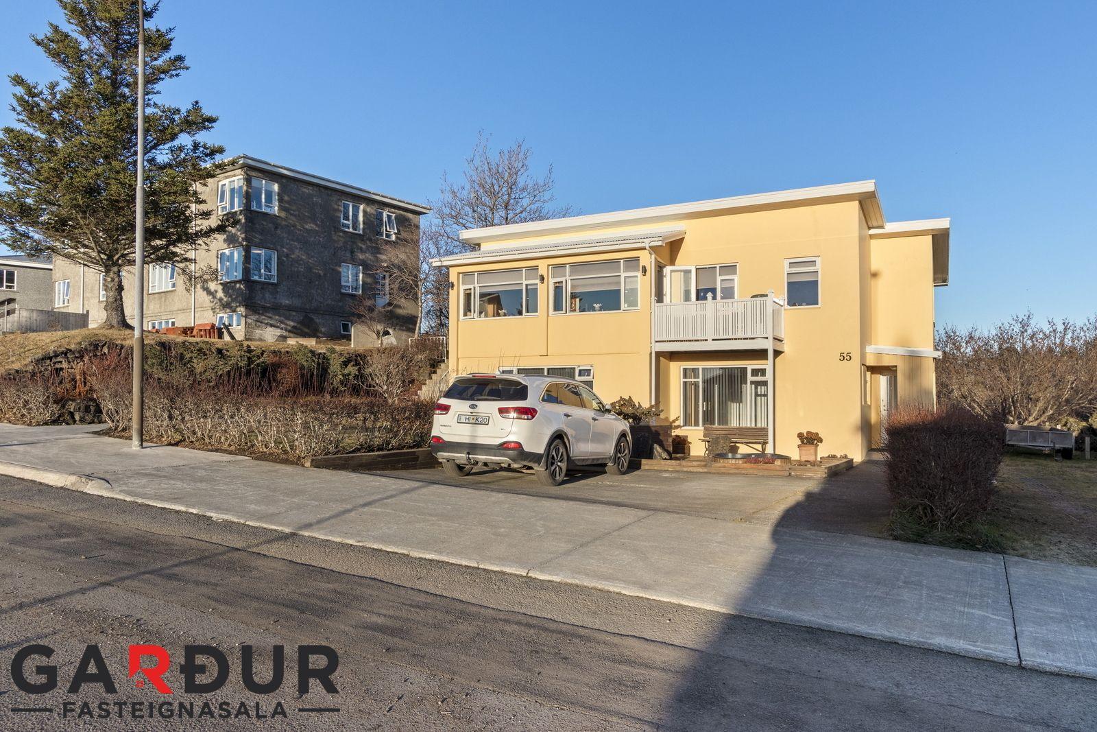 Efri hæð: Virkilega falleg og björt 4ra til 5 herbergja 114.4 fm íbúð með glæsilegu útsýni yfir miðbæ Hafnafjarðar. Anddyri: Rúmgott anddyri með innbyggðum fataskáp. Þvottahús: Endurnýjað 2023. inn af anddyri er þvottahús með fallegum hvítum innréttingum, góðum borðplássi tengi fyrir lítinn ísskáp, þvottavél og þurrkari í vinnuhæð. Góður gluggi með opnanlegu fagi. Baðherbergi: Vikilega fallegt baðherbergi sem er nýlega búið að endurnýja(2023). Baðherbergið er hannað af Elínu Thor. Innréttingar frá Formus og falleg borðplata með innfeldri handlaug frá Steinlausnum ehf. Flísar frá Harðviðarval og blöndunartæki frá Epson. Walk in sturta með innbyggðum blöndunartækjum, glerskilrúmi og fallegri lýsingu. Hjónaherbergi: Fallegt hjónaherbergi með góðum fataskápum sem ná upp í loft Útveggur fyrir aftan hjónaherbergi var þykktur og lagt nýtt raflagnaefni ásamt því að gera ráð fyrir innfeldum rúmgafli. Svefnherbergi II: Gott barnaherbergi með fataskáp. Parket á gólfi. Þar sem herbergið er staðsett var upprunalega gert ráð fyrir stigaopi niður á 1.hæð. Svefnherbergi II: Gott barnaherbergi með fataskáp. Parket á gólfi. Stofa: Björt og stór stofa með glæsilegu útsýni yfir Miðbæ Hafnafjarðar og víðar. Borðstofa og góð setustofa. Á teikningu er gert ráð fyrir svefnherbergi þar sem setustofan/sjónvarpshol er staðsett í dag. Svalir: Búið er að yfirbyggja yfir eldri svalirnar og opna inn í það rými svo það sé góður gangur milli borðstofu og eldhús. Góðar svalir sem voru bætt við eftir á til suðurs þar sem hægt er að njóta útsýnisins. Eldhús: Stórt og rúmgott eldhús með fallegri innréttingu, tengi fyrir uppþvottavél, háfur, nýlegur bakarofn (2025), tengi fyrir tvöfaldan ísskáp, tækjaskápur og borðkrókur.