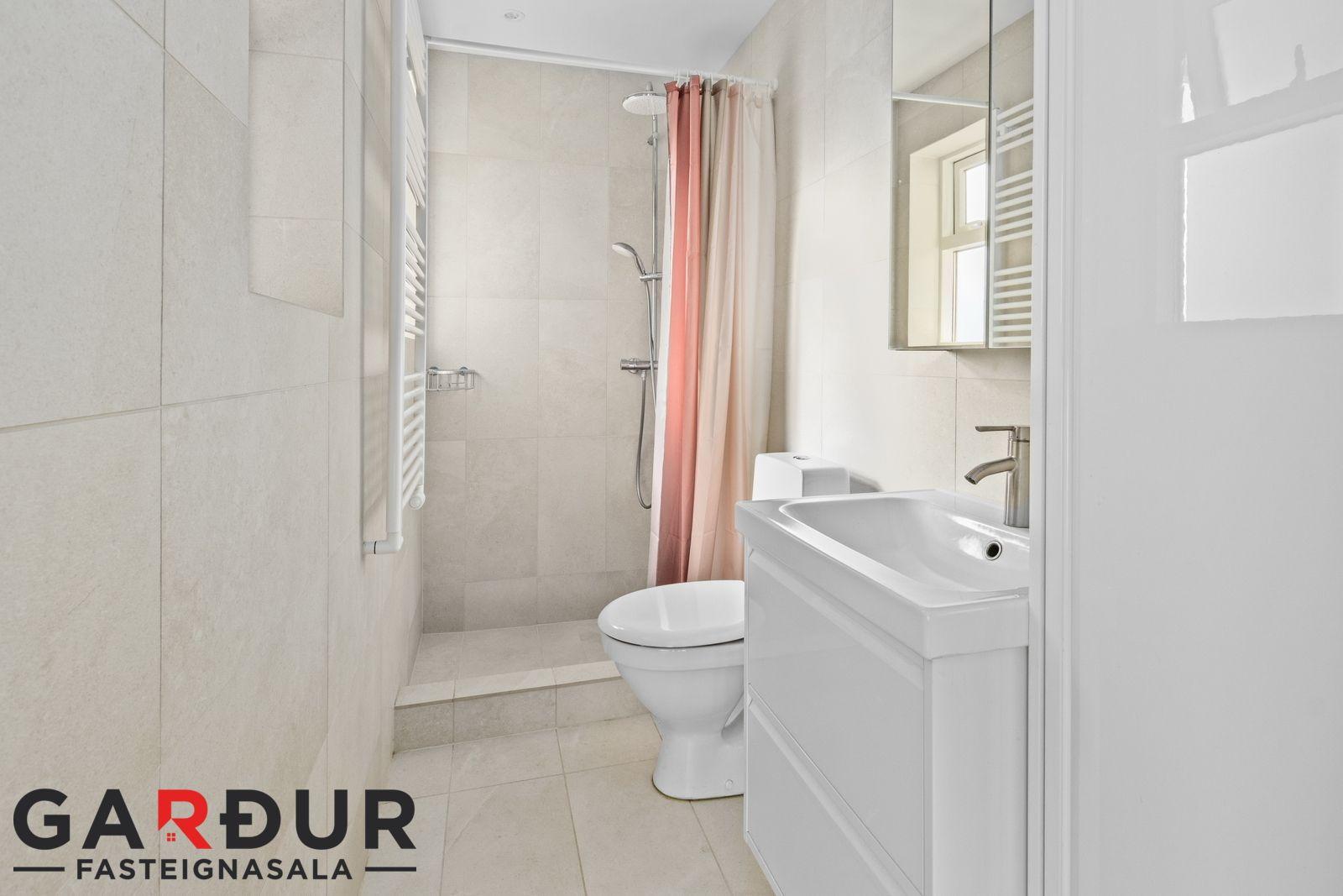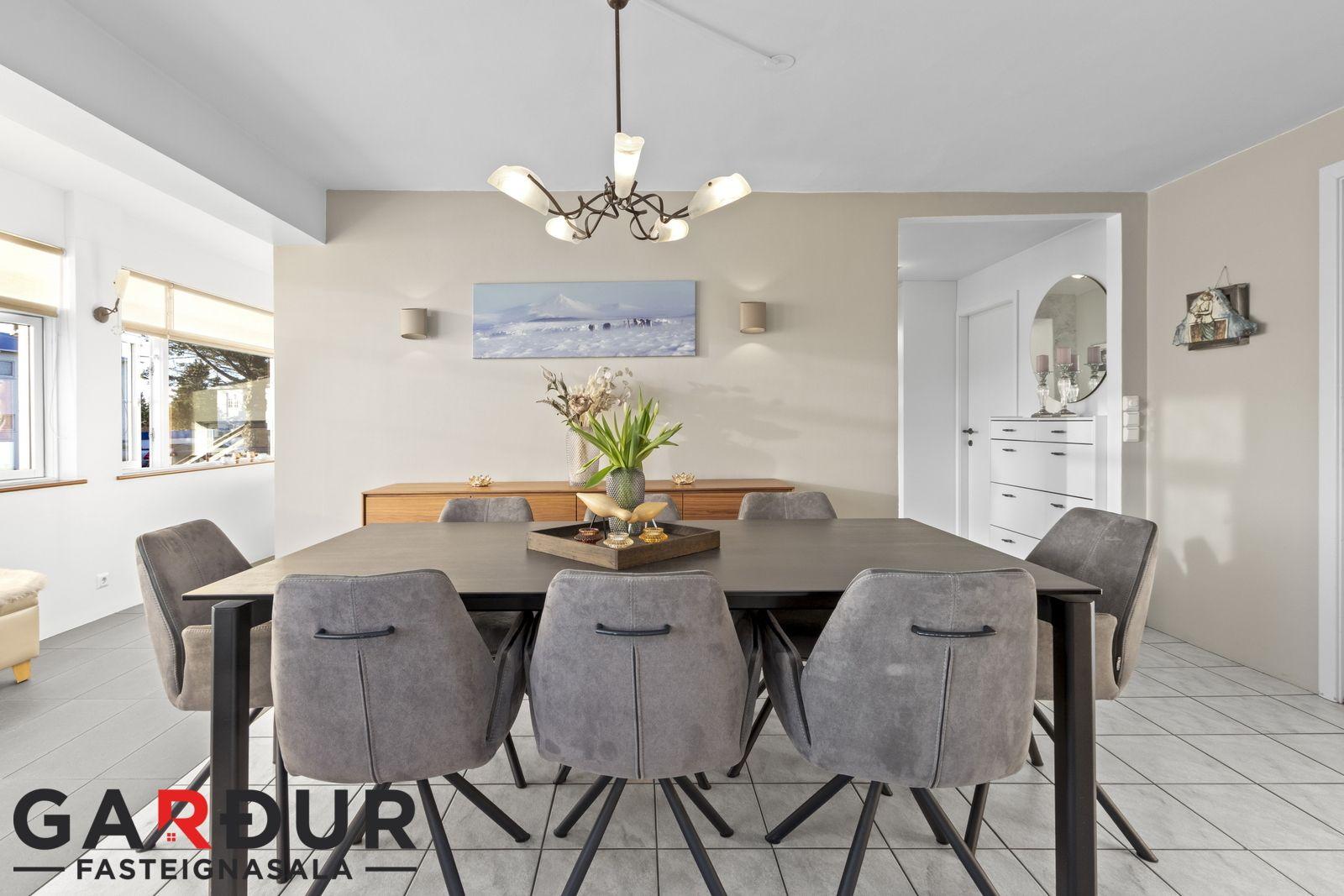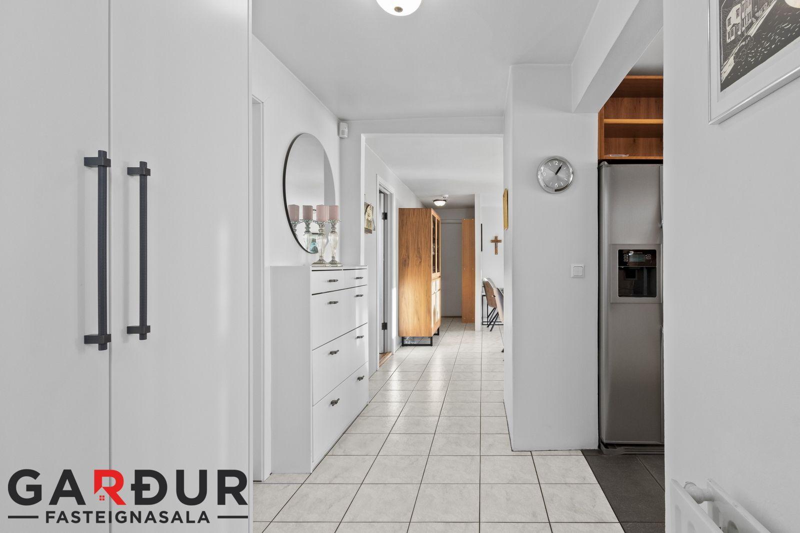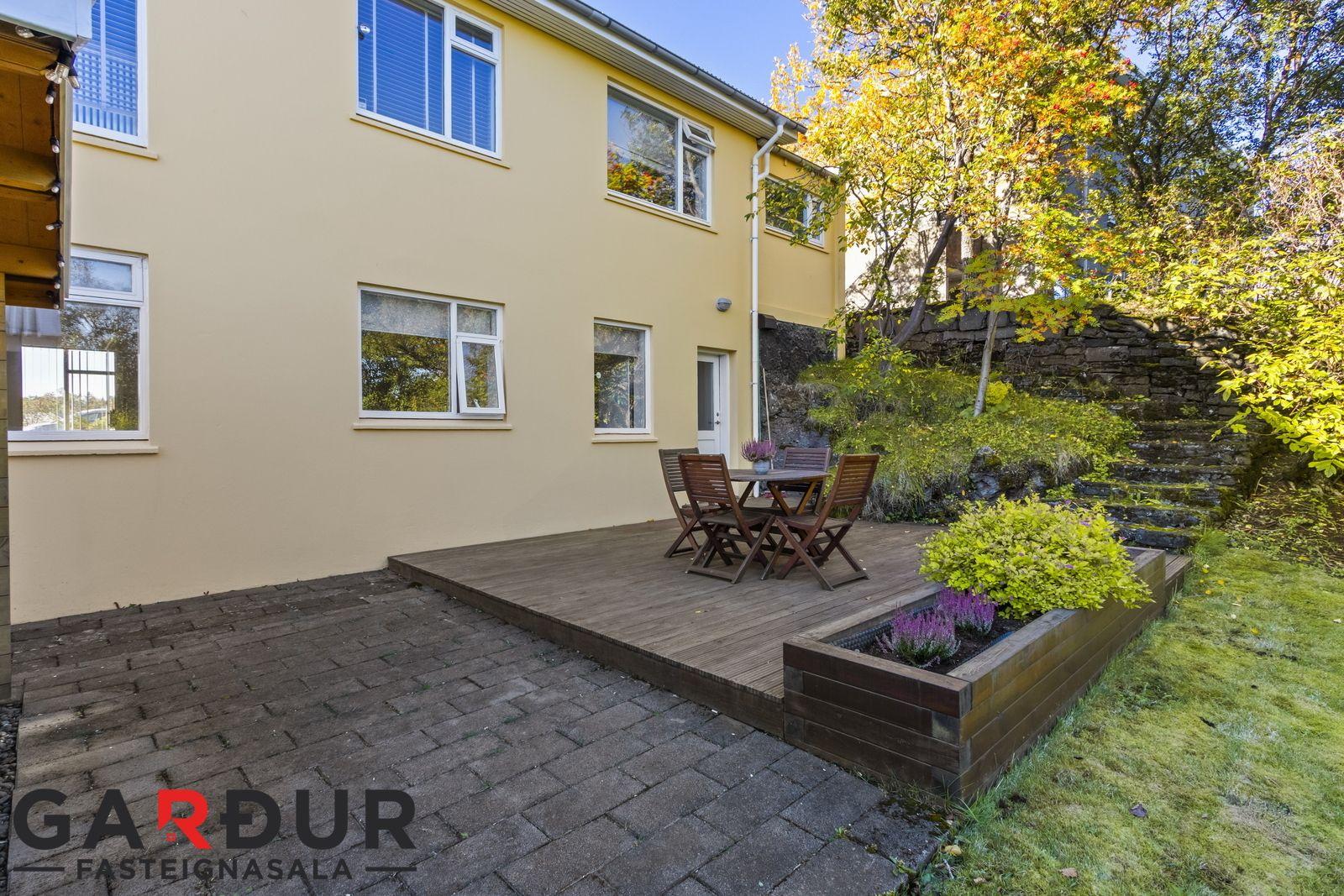 Neðri hæð: Falleg 98,9 fm 3ja til 4ra hebergja íbúð á 1.hæð Anddyri: Sérinngangur, forstofa með fatahengi. Svefnherbergi: Inn af anddyri er rúmgott svefnherbergi með góðum fataskáp. Baðherbergi: Nýlega endurnýjað baðherbergi með góðri walk in sturtu, hvít innrétting og handklæðaofn. Baðherbergið var endurnýjað 2024. Hol: Rúmgott hol sem áður var nýtt sem svefnherbergi. Auðvelt að setja upp vegg til þess að útbúa herbergið. Svefnherbergi II: Rúmgott svefnherbergi með fataskáp. Stofa: Mjög björt stofa og borðstofa með góðum glugga Eldhús: Falleg hvít eldhúsinnrétting með góðu skápaplássi, tengi fyrir uppþvottavél og bakarofn í vinnuhæð. Innréttingin lýtur vel út og er gott pláss í kringum innréttinguna. Inn af eldhúsi er bakinngangur þar sem er hægt að komast út á timburverönd út í garði. Þvottahús: Gott þvottahús með hvítri innréttingu þar sem er pláss fyrir þvottavél og þurrkara í vinnuhæð. Þvottahúsgólf flotað og IKEA innrétting sett upp 2024.