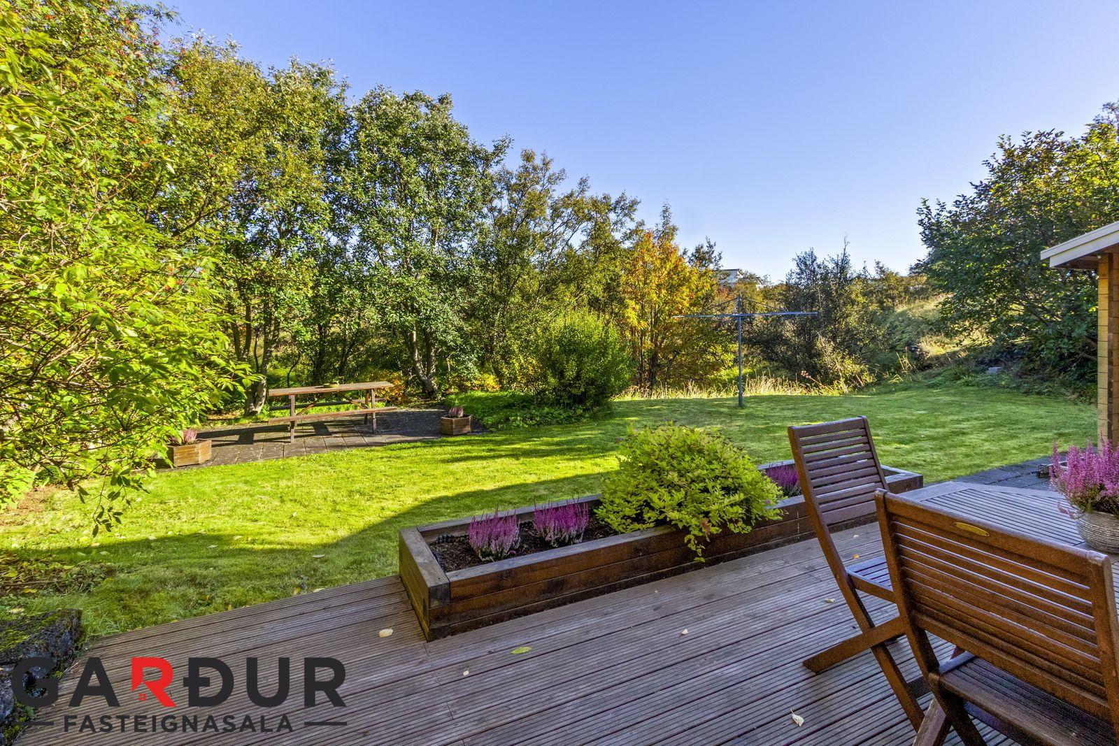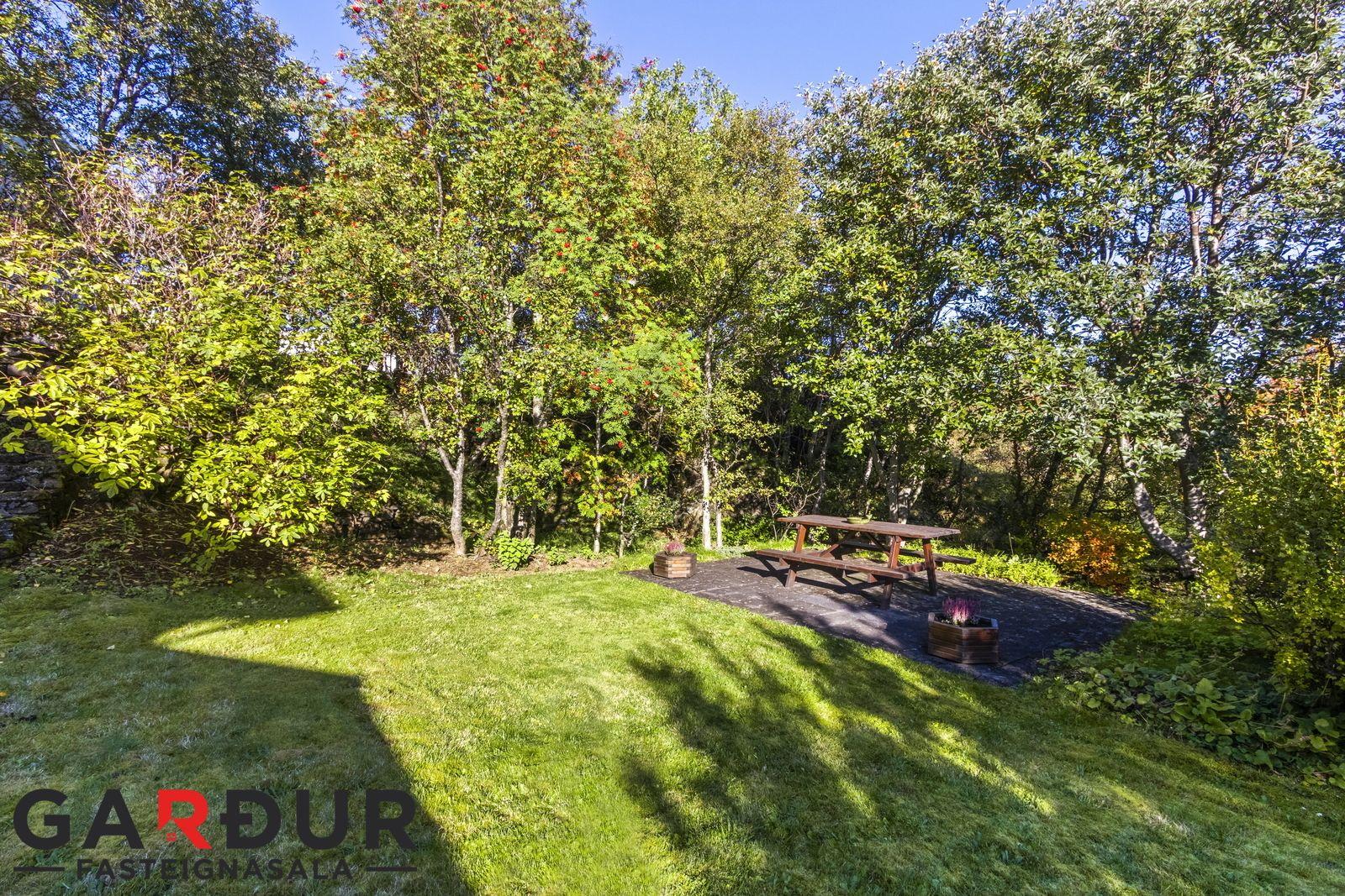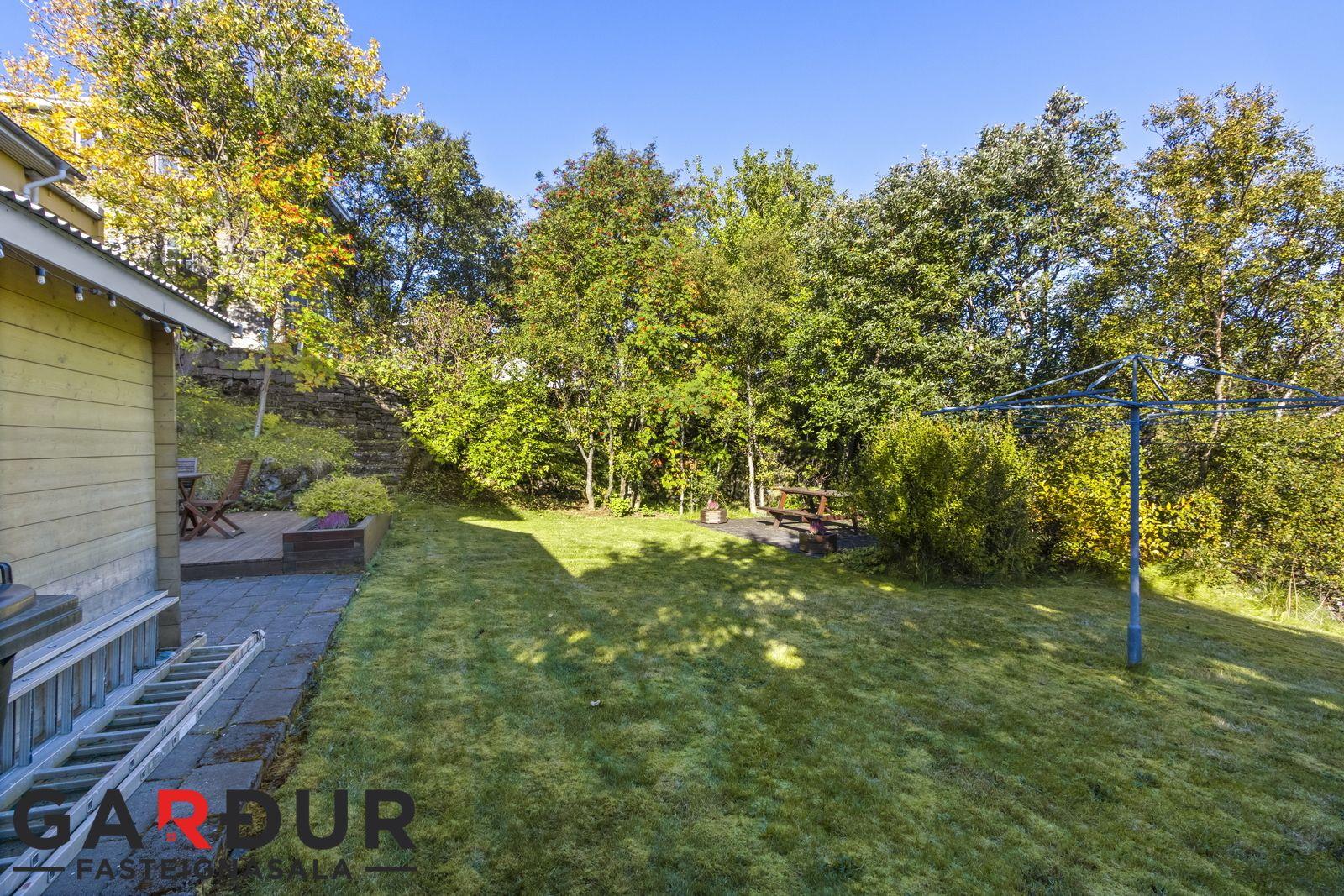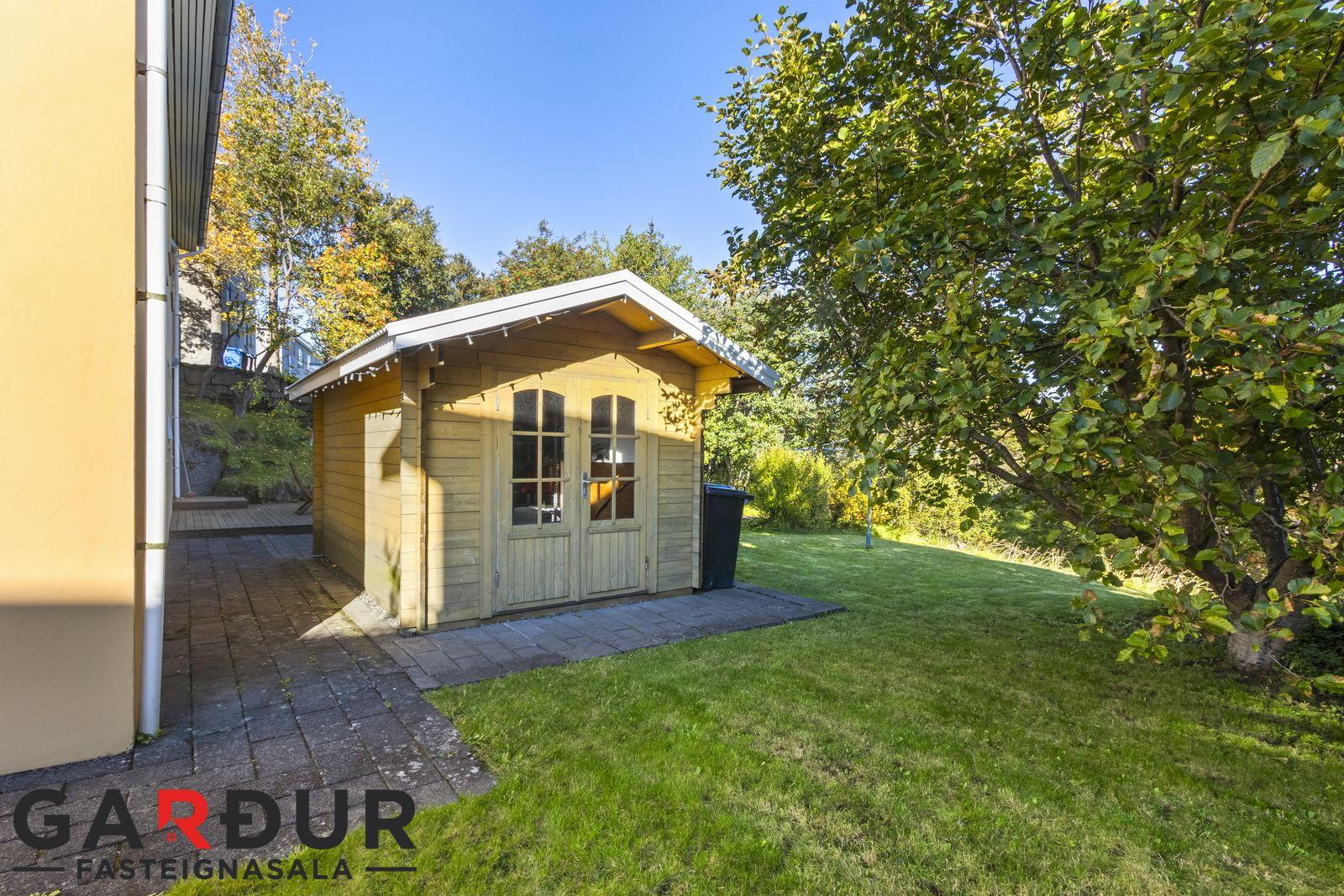 Garðurinn: Á lóðinni (631 fm) eru bílastæði fyrir framan hús með hleðslustöð fyrir rafbíla og einnig eru stæði með fram húsinu austan megin en þar á baklóð er möguleiki samkvæmt skipulagi að byggja bílskúr á lóð. Þessir möguleiki er háður leyfi skipulagsyfirvalda. Fyrir framan er mjög sólríkur sólpallur með fallegum gróðri og lítilli tjörn. Á baklóð er fallegur garður ásamt ca 10 fm geymsluskúr, búið er að leggja rafmagn að honum og er olíuofn notaður sem kynding. Falleg timburverönd, hellulögð stétt og gras að hluta en svo gengur hraunið inn í lóð að hluta en þar er landið ósnert og engin byggð.