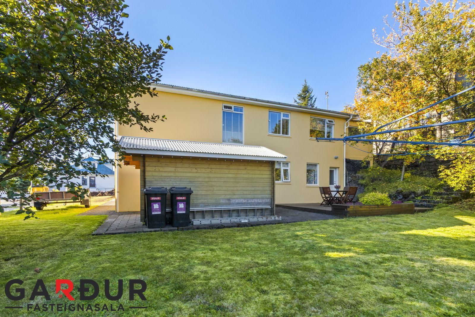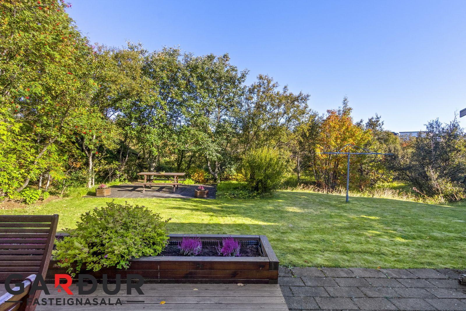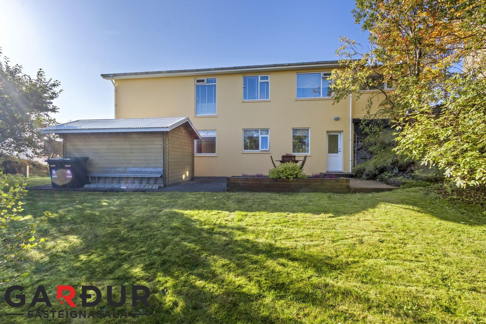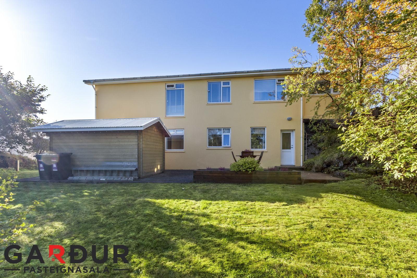 Garðurinn: Á lóðinni (631 fm) eru bílastæði fyrir framan hús með hleðslustöð fyrir rafbíla og einnig eru stæði með fram húsinu austan megin en þar á baklóð er möguleiki samkvæmt skipulagi að byggja bílskúr á lóð. Þessir möguleiki er háður leyfi skipulagsyfirvalda. Fyrir framan er mjög sólríkur sólpallur með fallegum gróðri og lítilli tjörn. Á baklóð er fallegur garður ásamt ca 10 fm geymsluskúr, búið er að leggja rafmagn að honum og er olíuofn notaður sem kynding. Falleg timburverönd, hellulögð stétt og gras að hluta en svo gengur hraunið inn í lóð að hluta en þar er landið ósnert og engin byggð.