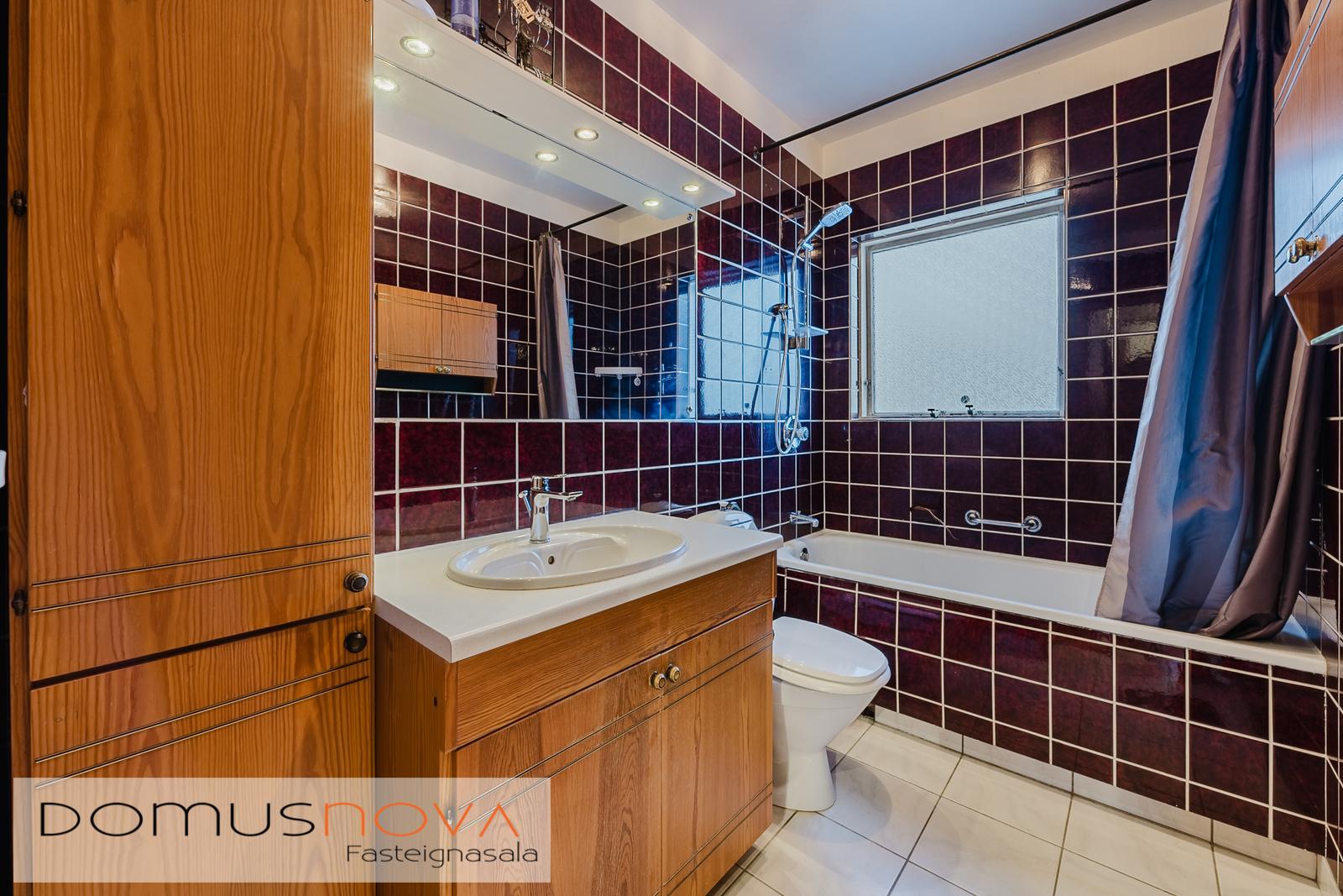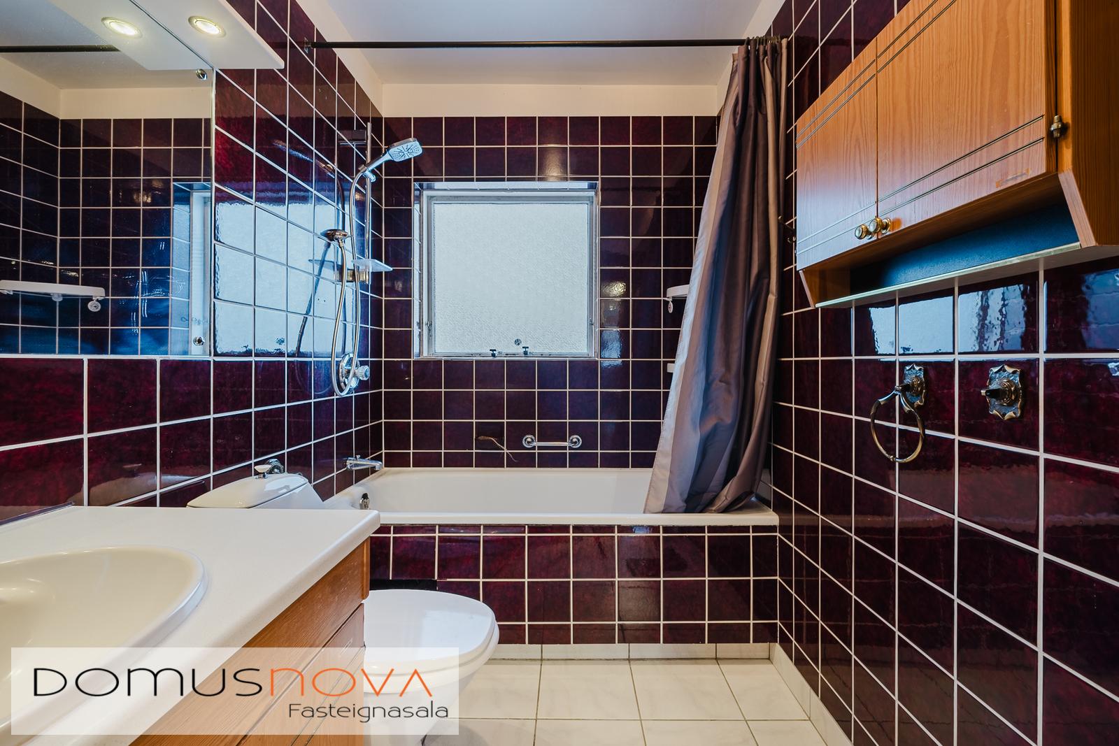 Baðherbergi - er eldra en snyrtilegt, baðkar með sturtuaðstöðu, skápapláss og vaskur ásamt wc, flísar á gólfi og veggjum.
