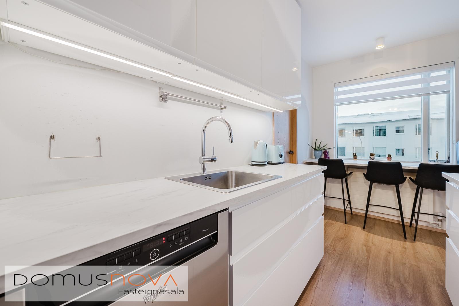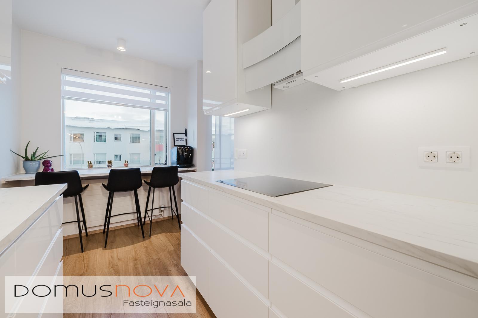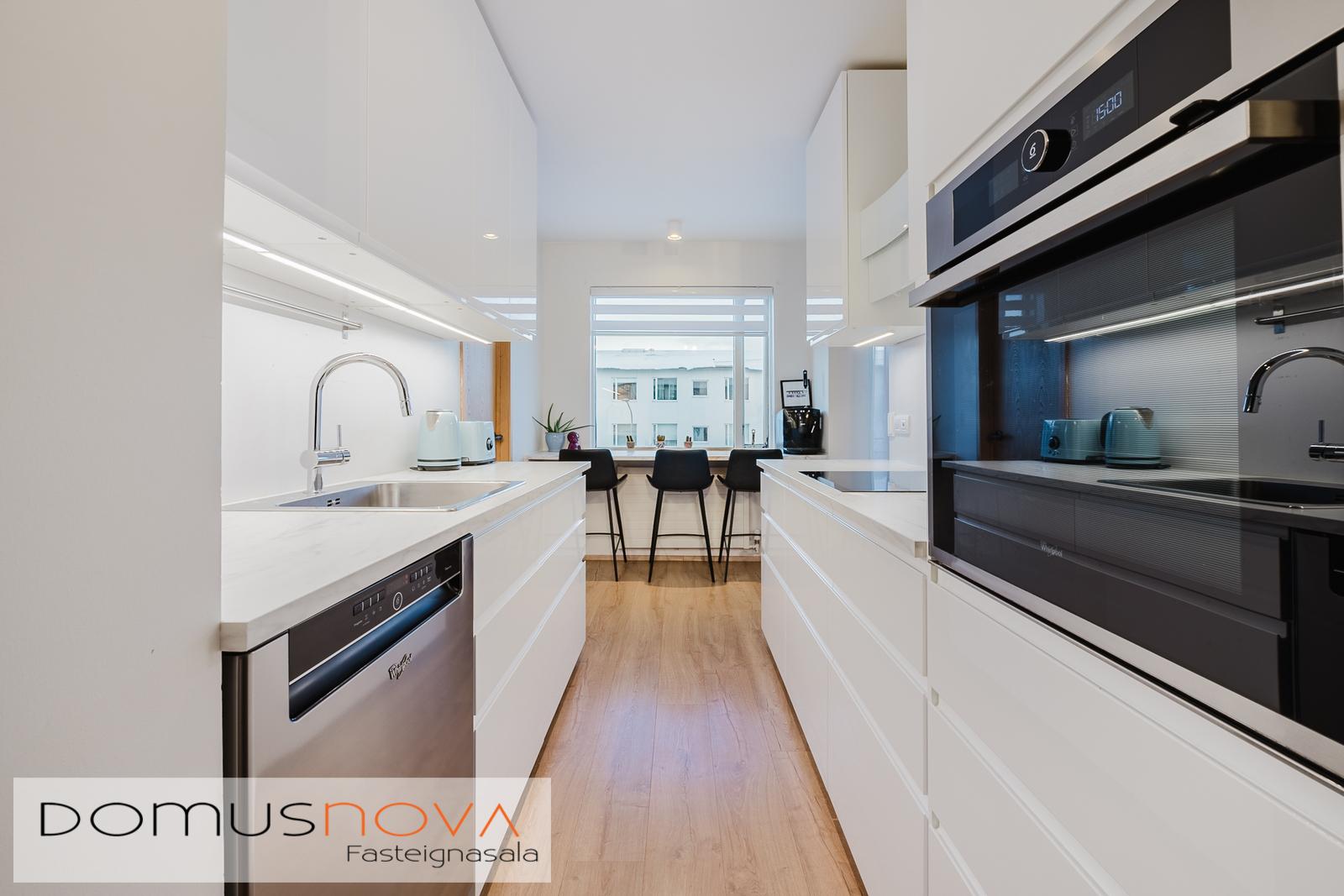 Eldhús - endurnýjað 2019 með fallegri hvítri innréttingu á gagnstæðum veggjum, lýsing í neðri skúffum, rafmagnsopnari á ruslaskúffunni með einni snertinu, tengi fyrir uppþvottavél, pláss fyrir tvöfaldan ísskáp, bakaraofn í vinnuhæð, helluborð og vifta ásamt góðu vinnuplássi á bekkjum. Setusvæði við eldhúsglugga sem nýtist vel til morgunverðar og smærri máltíða. Parket á gólfi.