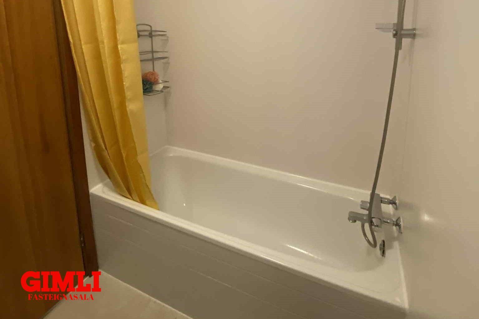 Baðherbergi: flísalagt gólf og hlið á baðkari, nýleg blöndunartæki, vaskaskápur, speglaskápur