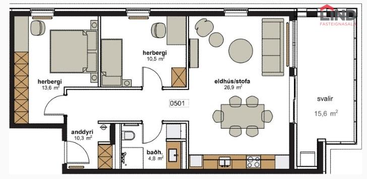 Íbúð 501: 80,7 fm 3ja herbergja íbúð á 5. hæð. Íbúðin er 80,7 fm þar af 3,6 fm geymsla