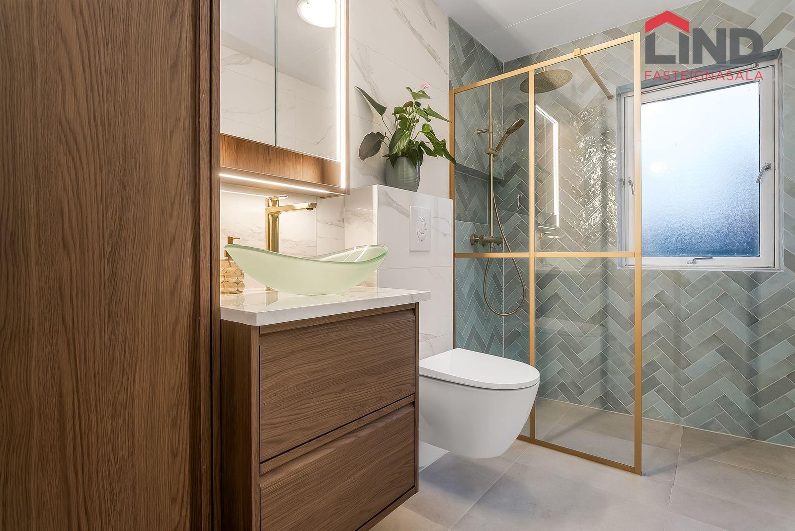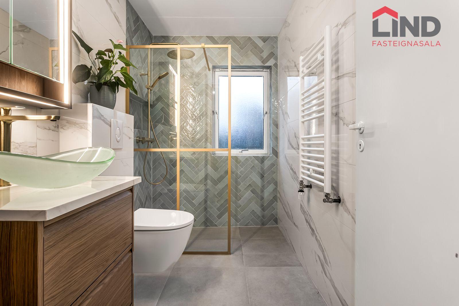 Á vinstri hönd úr holi er baðherbergi sem er nýuppgert með Glæsilegri innréttingu og walk-in sturtu. Nýjar flísar frá ÁLFABORG gólfi og veggjum. Ný blöndunartæki frá ÁLFABORG, handklæðaogn og gluggi er á baðherbergi.
