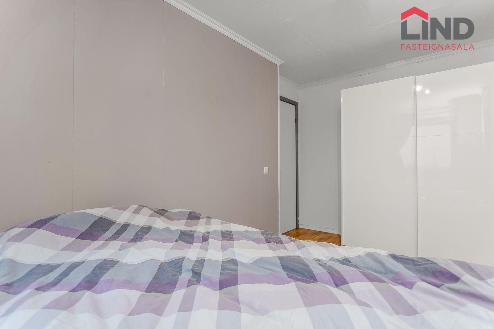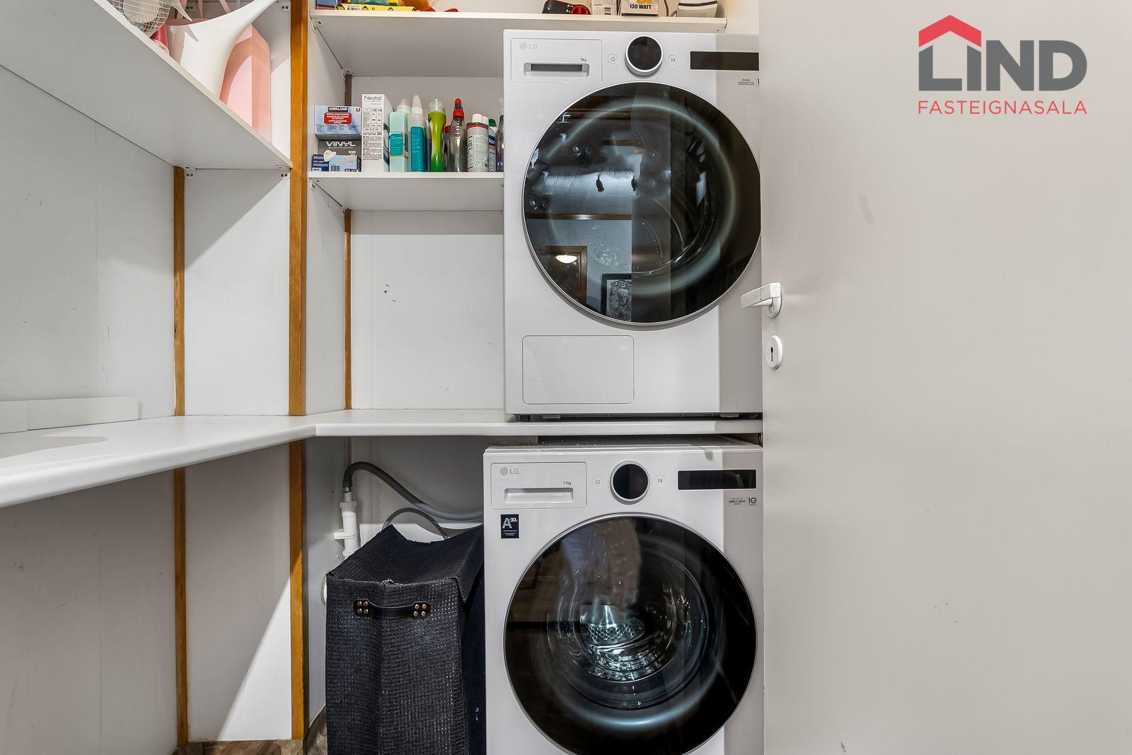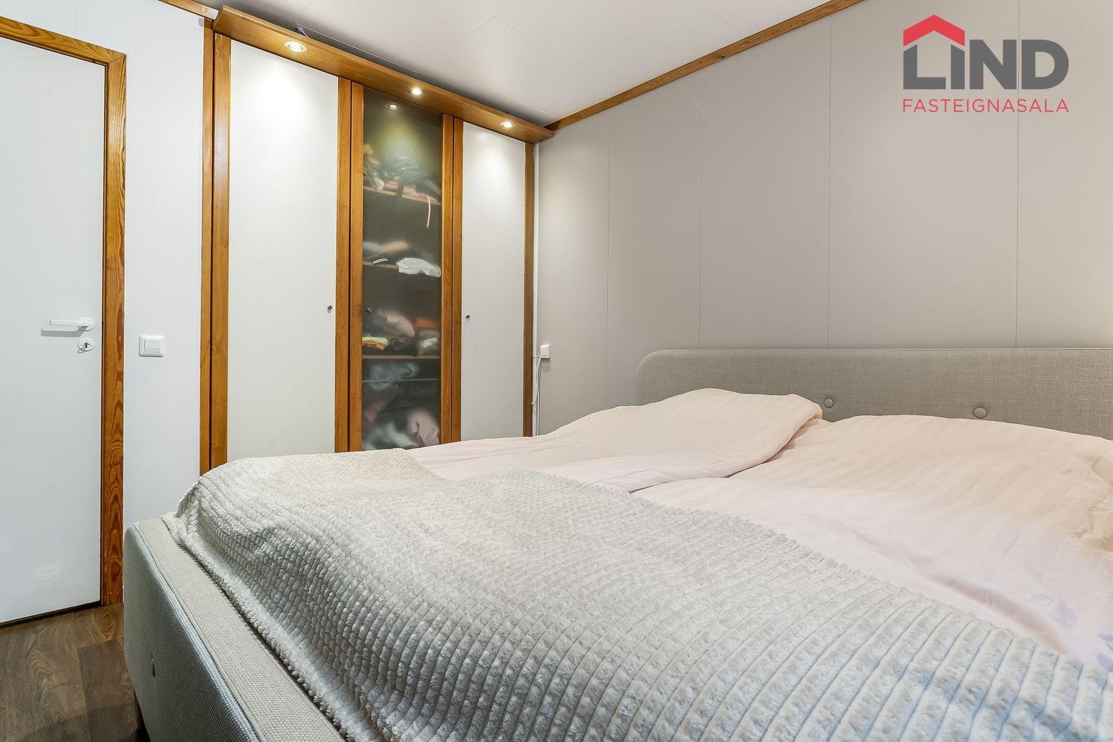 Á hægri hönd er hjónaherbergi með fataskáp og harðparketi á gólfi. Þar við hlið er þvottahús með vinnuborði og hillum, dúkur á gólfi.