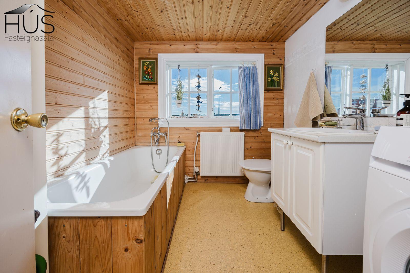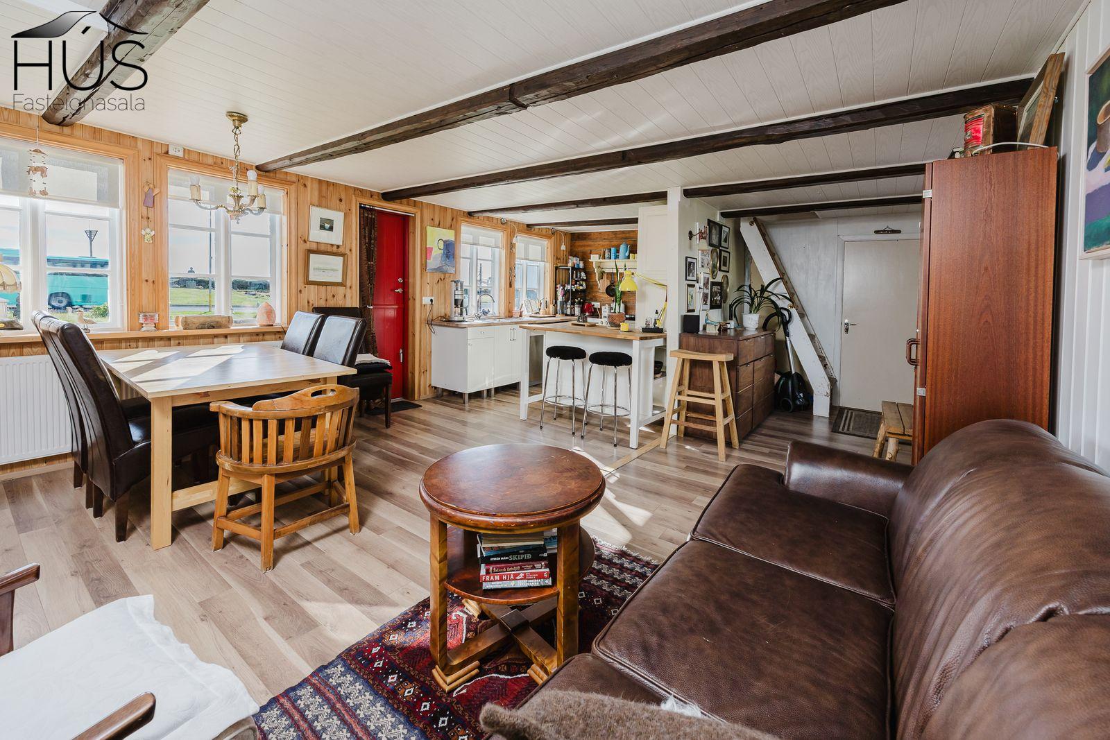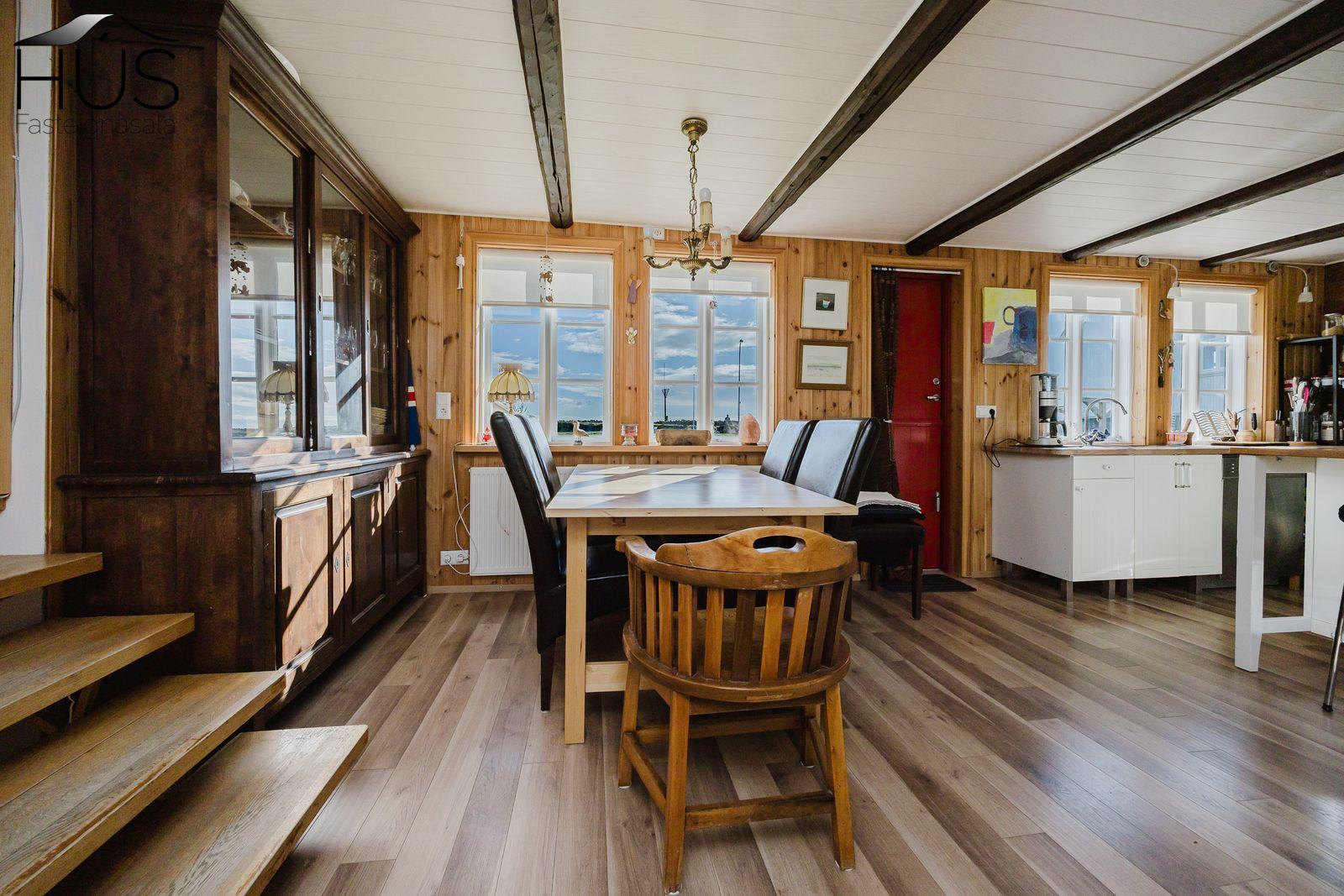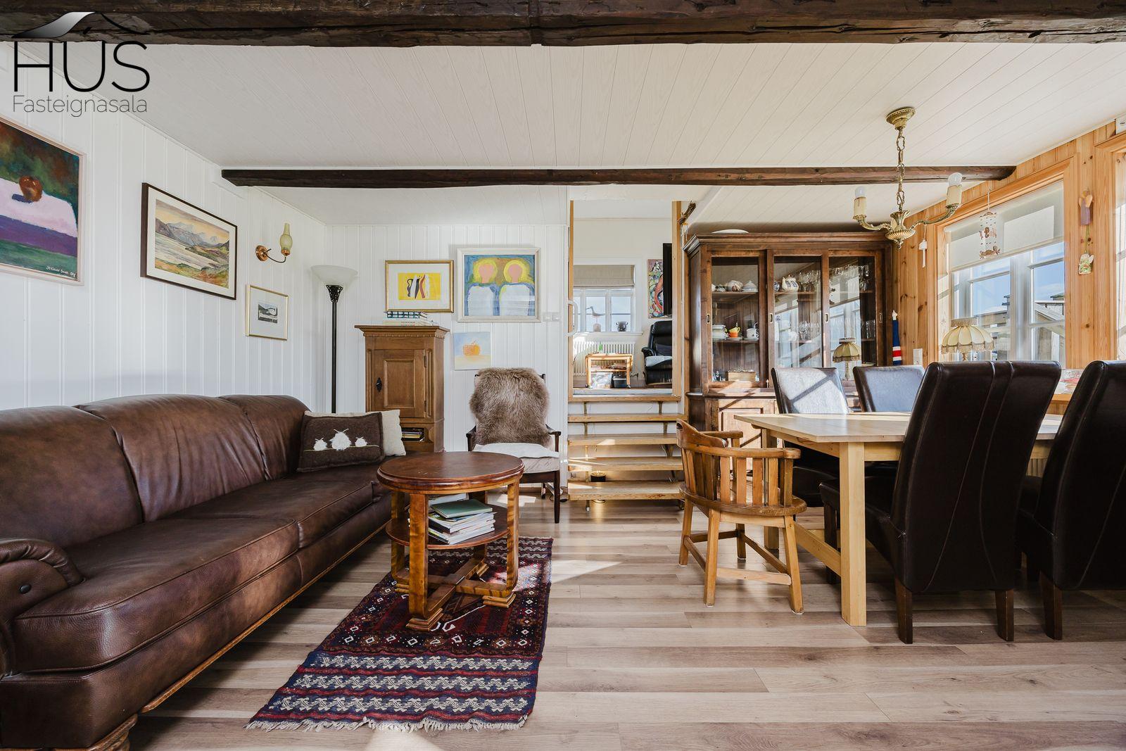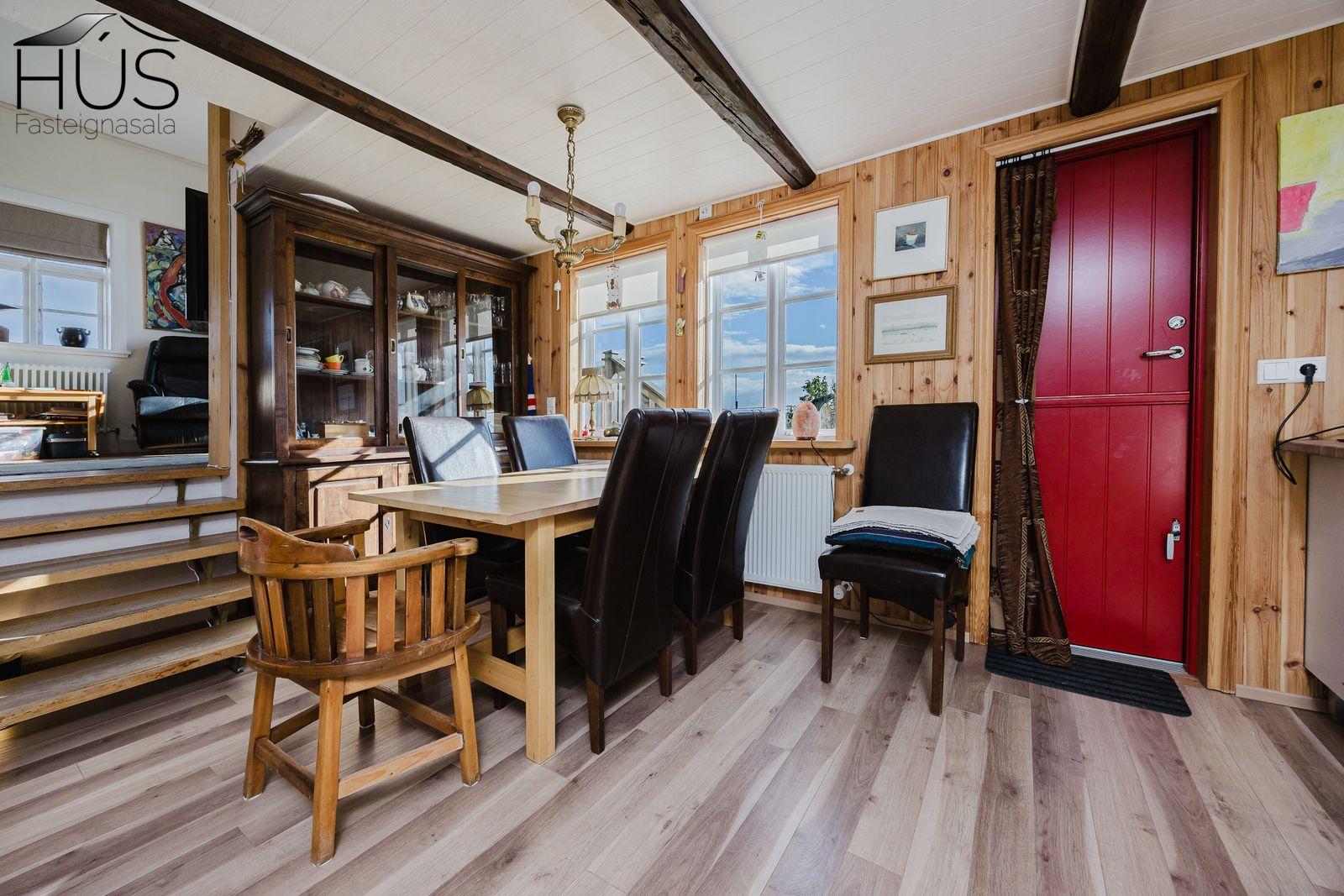 Nánari lýsing: Forstofa með fatahengi og inn af henni er baðherbergi með baðkari. Miðrými hússins telur endurnýjað eldhús, rúmgóða borðstofu og úr henni er gengið upp fjórar tröppur upp í stofuna. Úr stofunni er annars vegar útgengt á sólpall og hins vegar í hjónasvítu. Annað baðherbergi er inn af hjónasvítunni með sturtu, upphengdu wc og innréttingu. Brattur stigi er upp í ris hússins og þar eru tvö svefnherbergi, annað þeirra mjög rúmgott. Undir öllu húsinu er kjallari en bara að hluta til í góðri hæð og er hann nýttur sem vinnuaðstaða og geymsla. Bílskúr heldur vatni og vindum en þarfnast endurbóta. Á undanförnum árum hefur húsið talsvert verið endurnýjað bæði að innan sem utan. Má þar nefna rafmagn, lagnir, þak, klæðningu, glugga og m.fl.