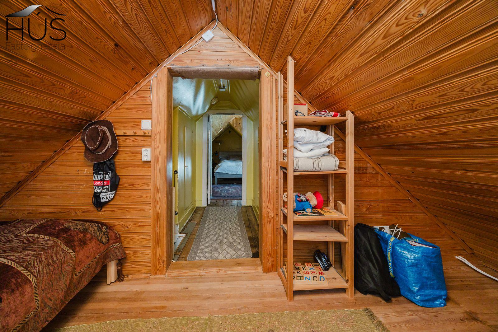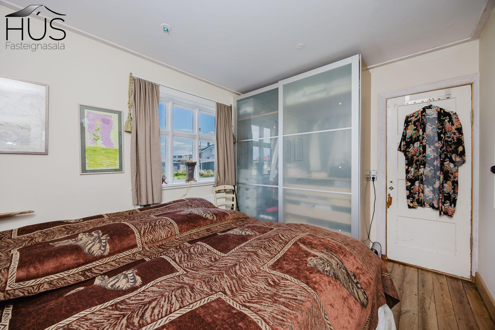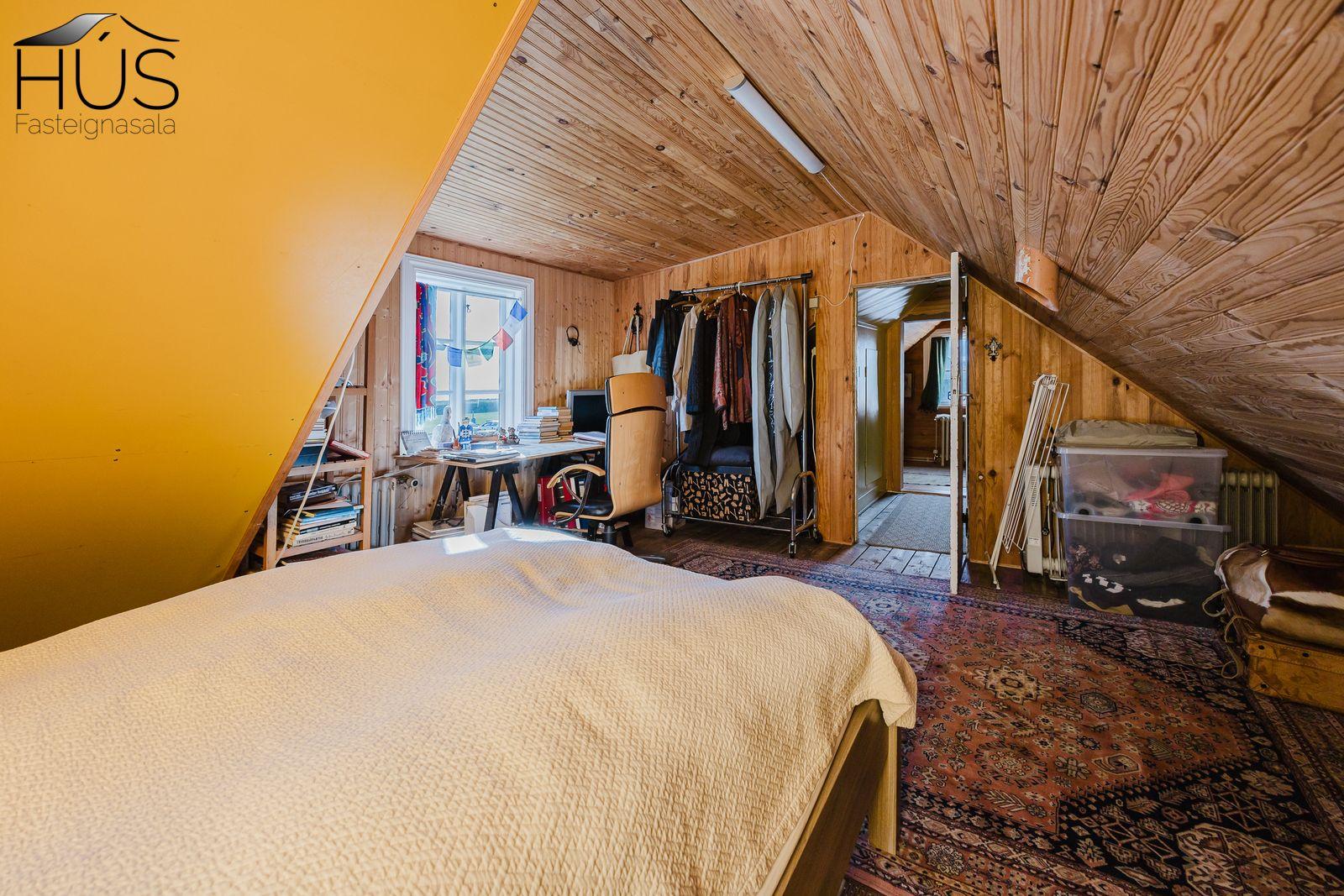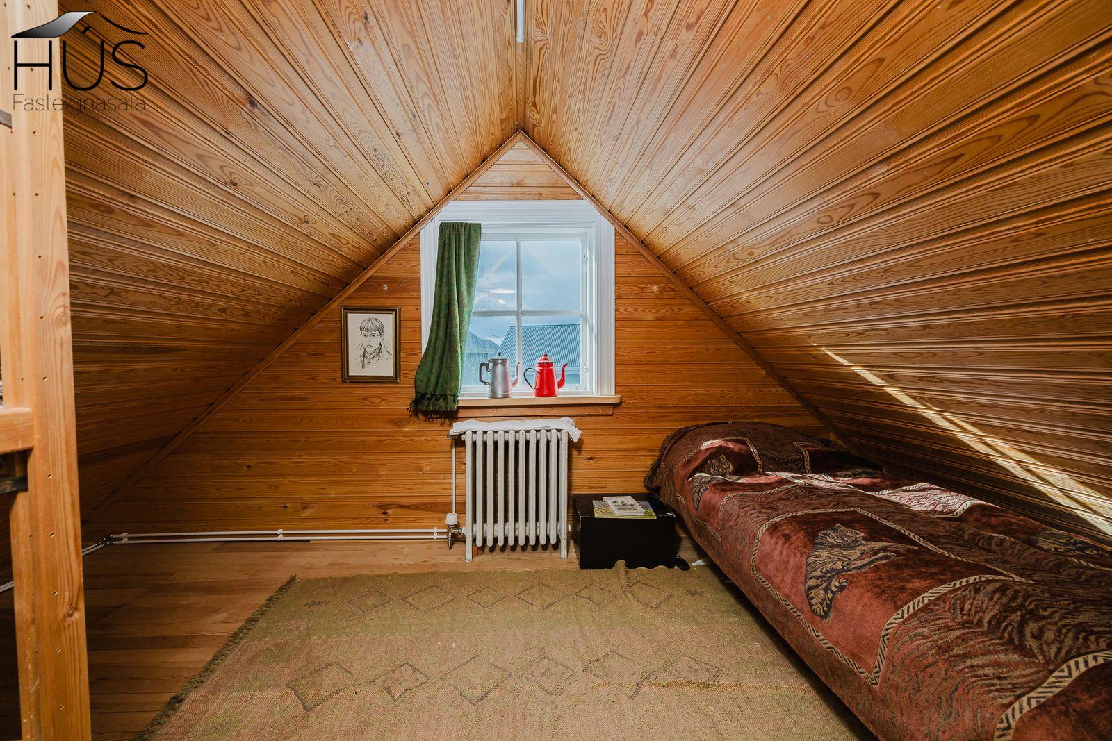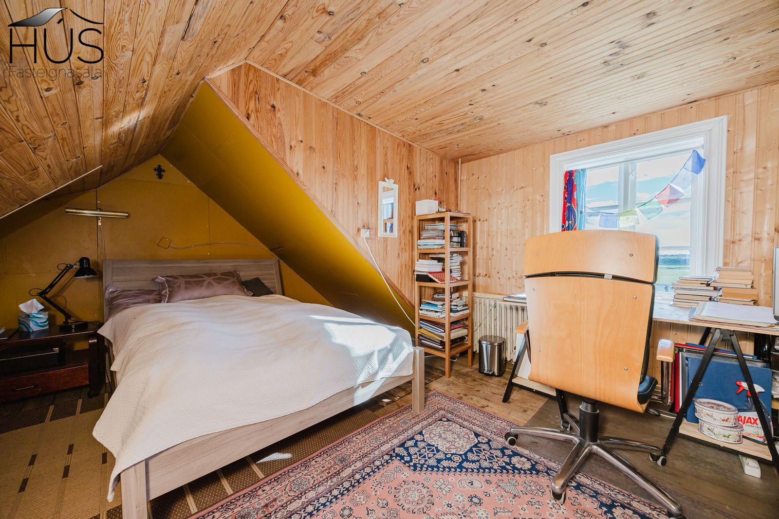 Nánari lýsing: Forstofa með fatahengi og inn af henni er baðherbergi með baðkari. Miðrými hússins telur endurnýjað eldhús, rúmgóða borðstofu og úr henni er gengið upp fjórar tröppur upp í stofuna. Úr stofunni er annars vegar útgengt á sólpall og hins vegar í hjónasvítu. Annað baðherbergi er inn af hjónasvítunni með sturtu, upphengdu wc og innréttingu. Brattur stigi er upp í ris hússins og þar eru tvö svefnherbergi, annað þeirra mjög rúmgott. Undir öllu húsinu er kjallari en bara að hluta til í góðri hæð og er hann nýttur sem vinnuaðstaða og geymsla. Bílskúr heldur vatni og vindum en þarfnast endurbóta. Á undanförnum árum hefur húsið talsvert verið endurnýjað bæði að innan sem utan. Má þar nefna rafmagn, lagnir, þak, klæðningu, glugga og m.fl.