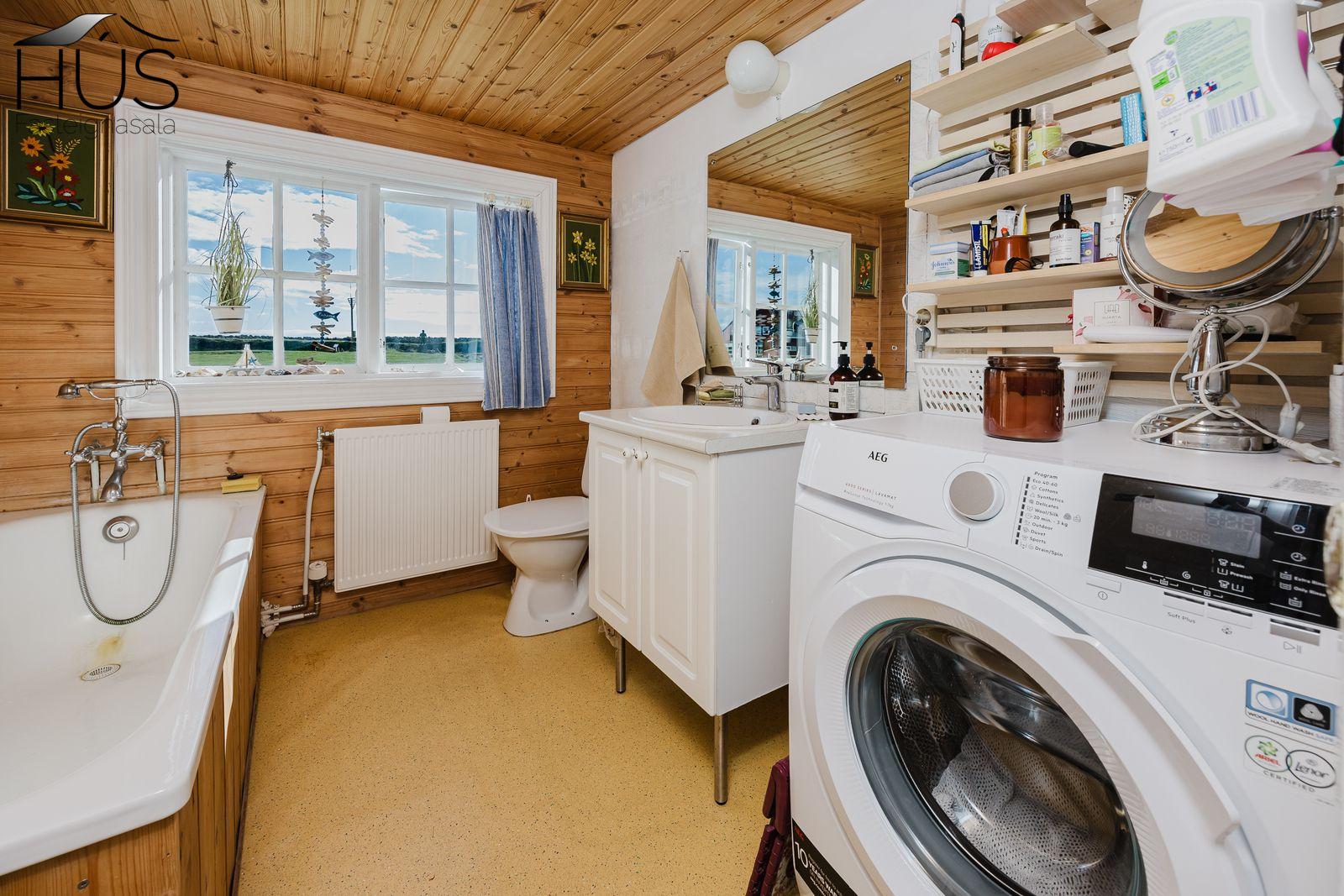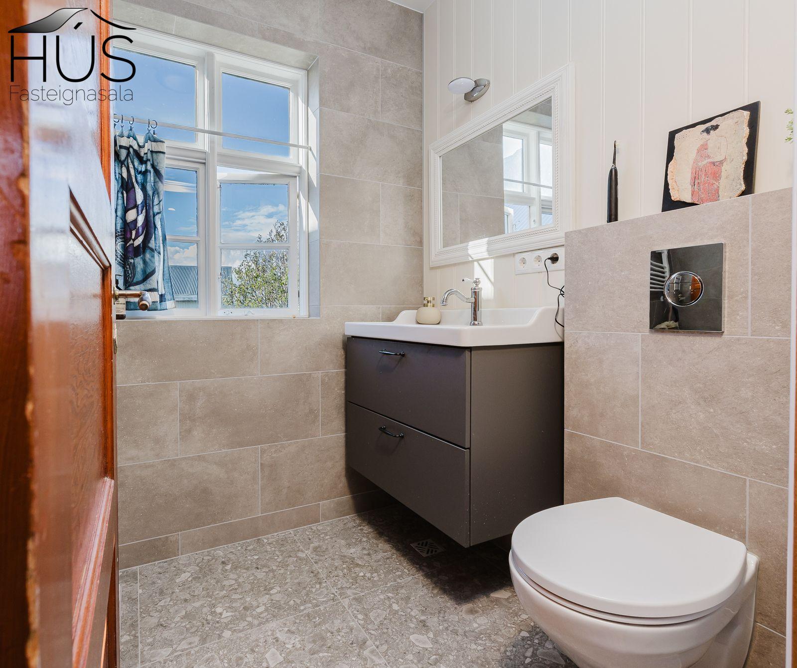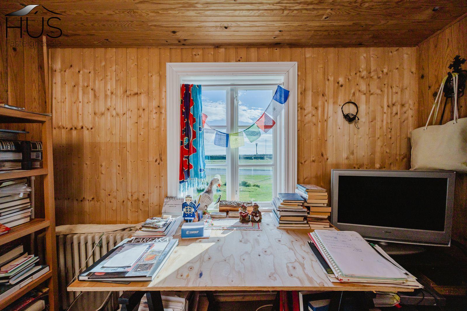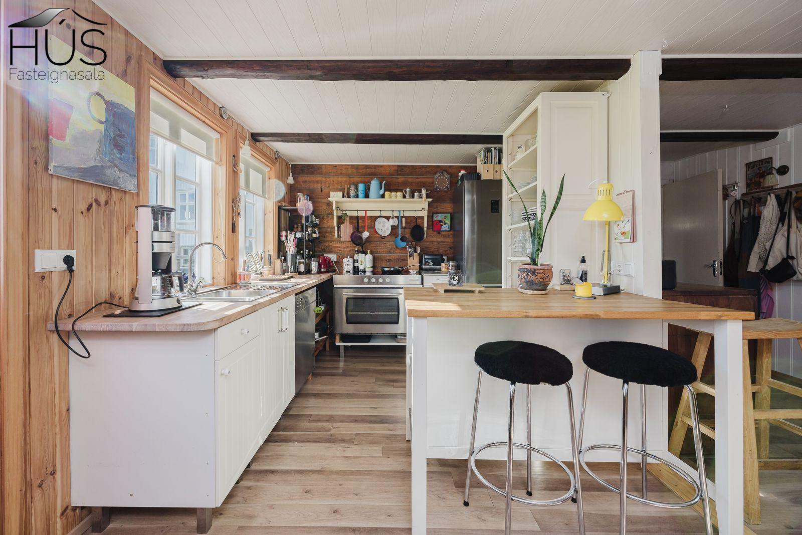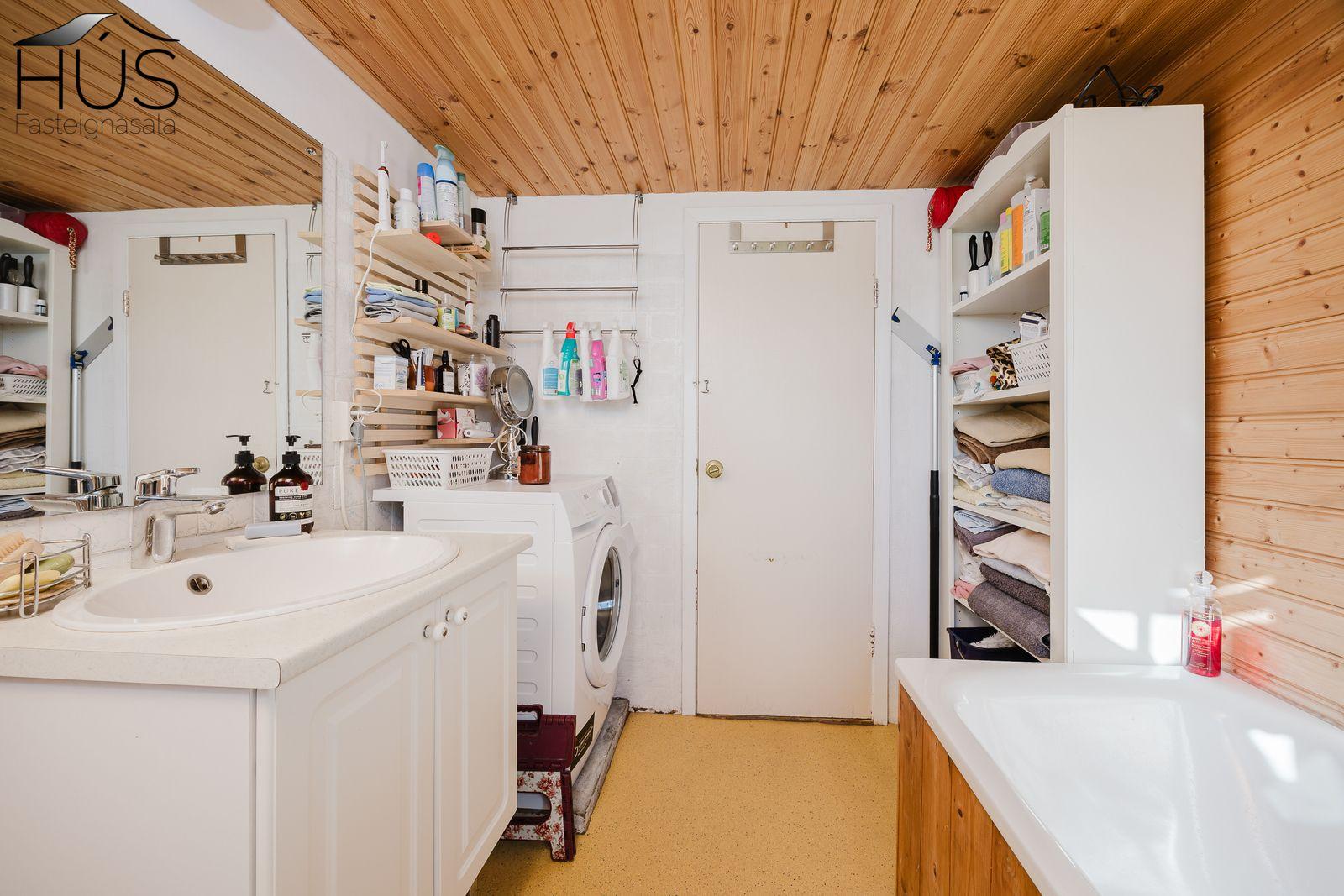 Nánari lýsing: Forstofa með fatahengi og inn af henni er baðherbergi með baðkari. Miðrými hússins telur endurnýjað eldhús, rúmgóða borðstofu og úr henni er gengið upp fjórar tröppur upp í stofuna. Úr stofunni er annars vegar útgengt á sólpall og hins vegar í hjónasvítu. Annað baðherbergi er inn af hjónasvítunni með sturtu, upphengdu wc og innréttingu. Brattur stigi er upp í ris hússins og þar eru tvö svefnherbergi, annað þeirra mjög rúmgott. Undir öllu húsinu er kjallari en bara að hluta til í góðri hæð og er hann nýttur sem vinnuaðstaða og geymsla. Bílskúr heldur vatni og vindum en þarfnast endurbóta. Á undanförnum árum hefur húsið talsvert verið endurnýjað bæði að innan sem utan. Má þar nefna rafmagn, lagnir, þak, klæðningu, glugga og m.fl.