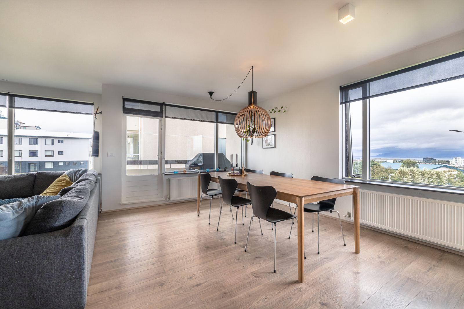 Eldhús: Nýlega endurnýjað, gott skápapláss, ný spanhella og nýr háfur. Borðkrókur við gluggann og mikið útsýni. Hiti í gólfi og sér rafmagnstafla.