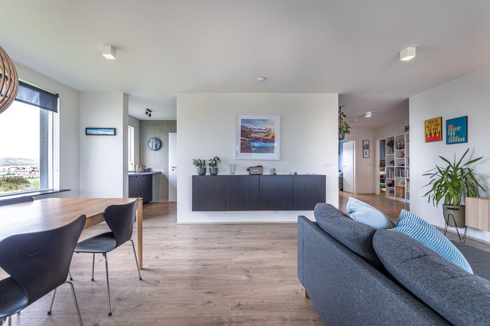 Stofa: Mjög rúmgóð stofa með útgengi á svalir. Gert er ráð fyrir "húsbóndaherbergi" á teikningu en ef það hefur einhverntíman verið þá hefur það nú verið fjarlægt.