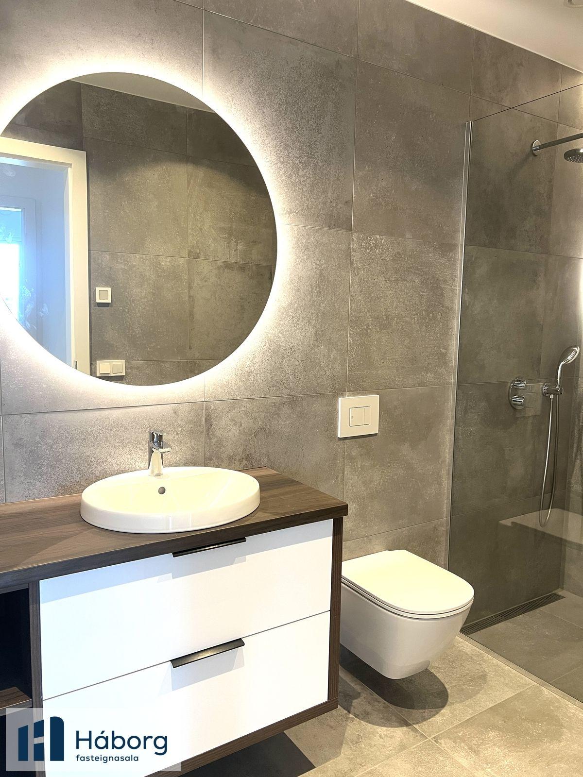 Háborg fasteignasala ehf, Jórunn lögg. fasteignasali og Kristín Rós Magnadóttir lögg. fasteignasali kynna Grensásvegur 1F, nýbygging. Eign á 3.hæð, stærð 83,4 fm, í 108 Reykjavík. Glæsileg 2ja herbergja með fallega innréttuðu alrými, eldhús með eyju sem hægt er að sitja og gengið út á suð-austur svalir úr stofu, útsýni til Esjunar. Stofa er rúmgóð og björt með gólfsíðum gluggum. Hjónaherbergið er einnig með gólfsíðum gluggum, það er mjög rúmgott og með fataherbergi. Barnaherbergið er einnig með gólfsíðum gluggum og góðum fataskápum. Baðherbergið er flísalagt að hluta, með sturtu sem gengið er beint inní, óbein lýsing fyrir ofan sturtu, skúffu innrétting undir handlaug og spegill fyrir ofan handlaug einnig með óbeinni lýsingu. Sér þvottahús innan íbúðar með góðri vinnuaðstöðu með skolvaski. Eigninni fylgir geymsla í kjallara að stærð 5,3 fm. Aðgengi að bílakjallara á 3.hæðum. Íbúðin er sýningaríbúð.