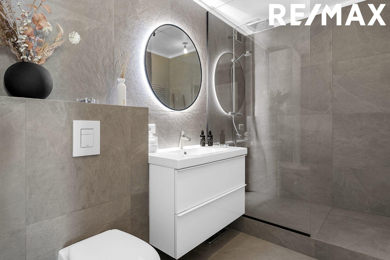 Baðherbergi: Baðherbergið er flísum á gólfi og tveimur veggjum. Skúffur eru undir vaski, góður skápur við hlið salernis, handklæðaofn. Rúmgóð þreplaus sturta með glerskilrúmi.