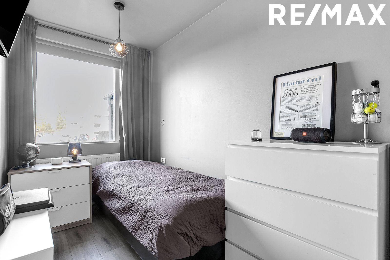 Herbergi: Hjónaherbergið er rúmgott með fimmföldum fataskápum sem ná upp í loft. Harðparket á gólfi.