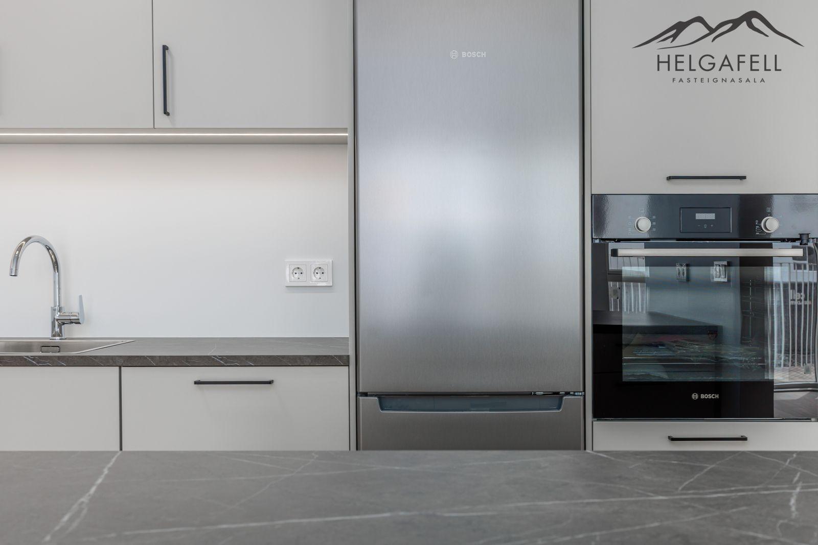 Stórt eldhús með eyju. Opið við stofu - L laga eldhúsinnrétting frá Kappa með góðu skápaplássi. Ísskápur, uppþvottavél, helluborð, gufugleypir og bakaraofn í vinnuhæð. Öll tæki frá Smith&Norland.