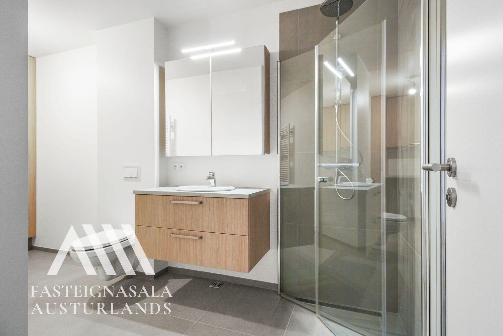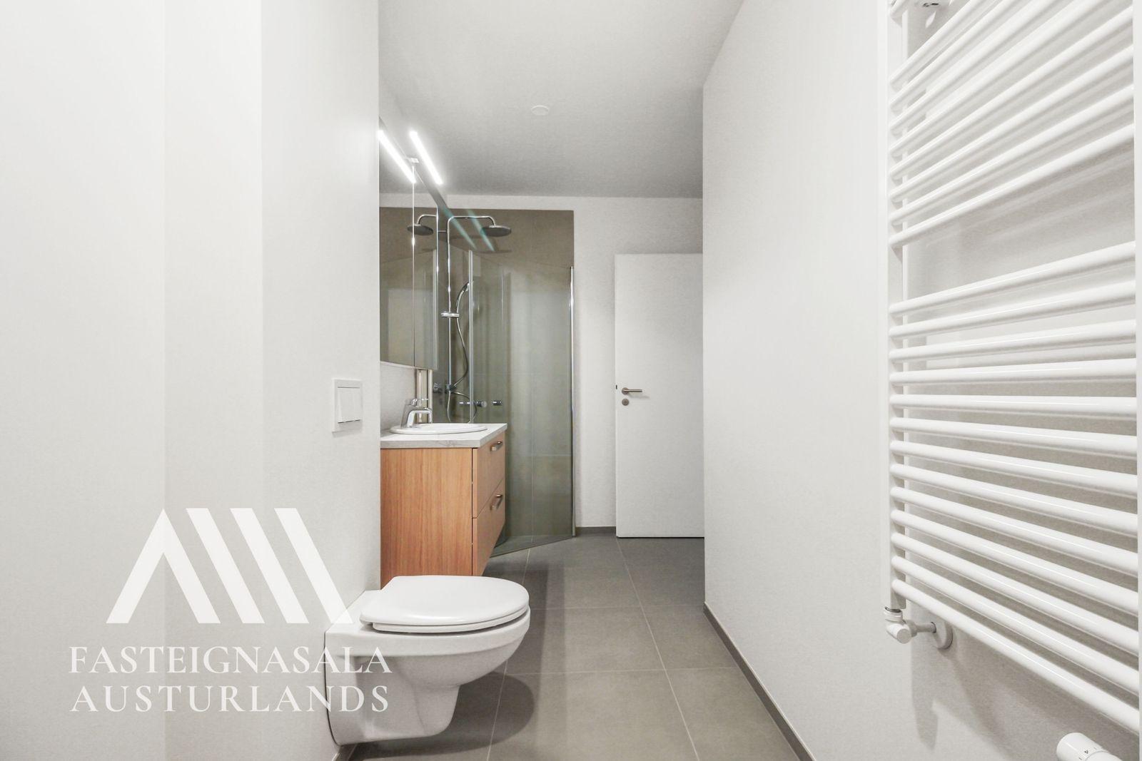 Baðherbergi er með flísum á gólfi, þar er sturta, vask innrétting og speglaskápur, vegghengt salerni. Veggir sturtuhorns baðherbergis eru flísalagðir. Vegghengdur handklæðaofn.