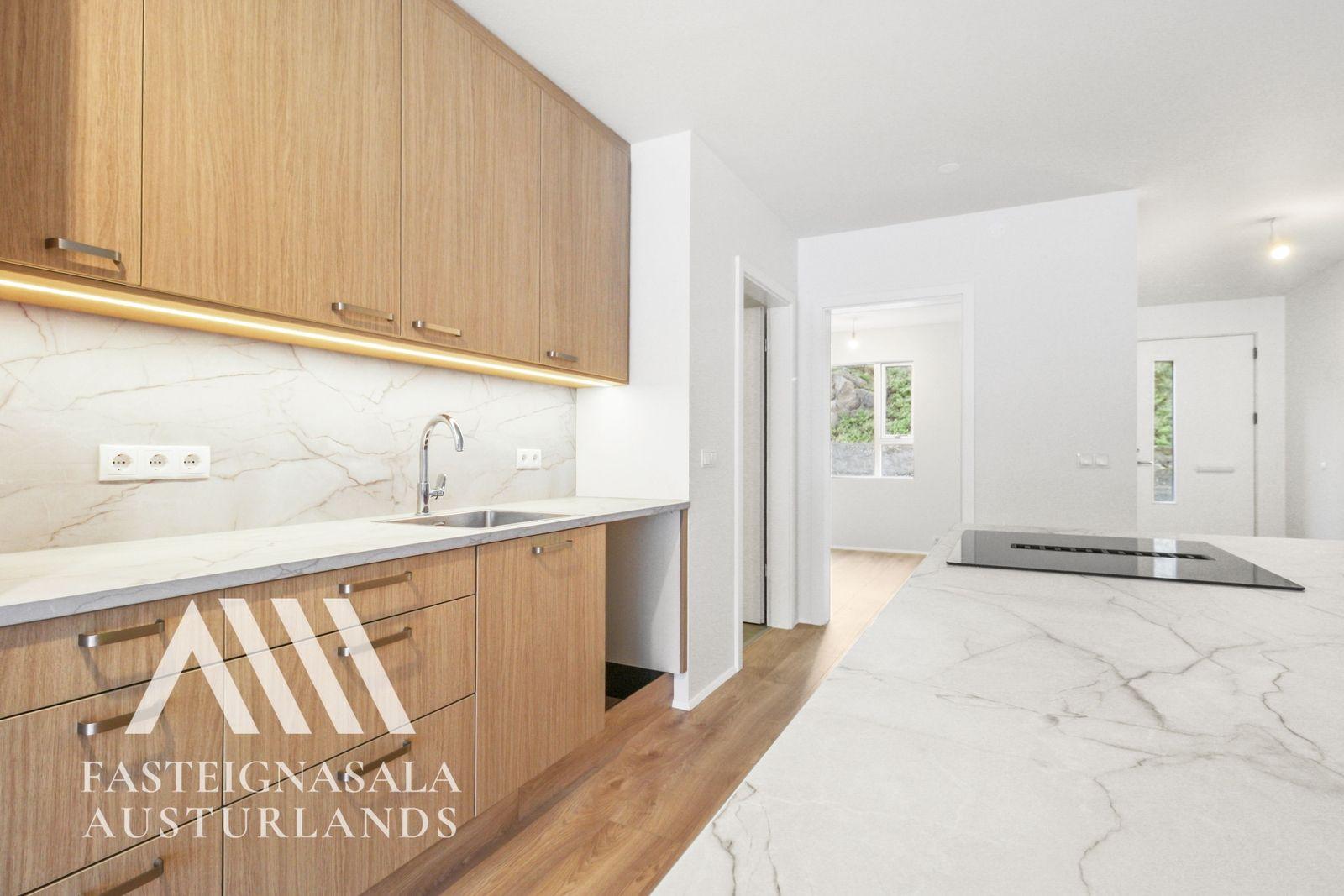 Eldhús með Axis innréttingu og eyju. Helluborð á eyju, ofn í vinnuhæð og stálvaskur með einnar handar blöndunartækjum. Gert er ráð fyrir innbyggðri uppþvottavél í innréttingu, framhlið fylgir með. Pláss er fyrir 200cm ísskáp í innréttingu.