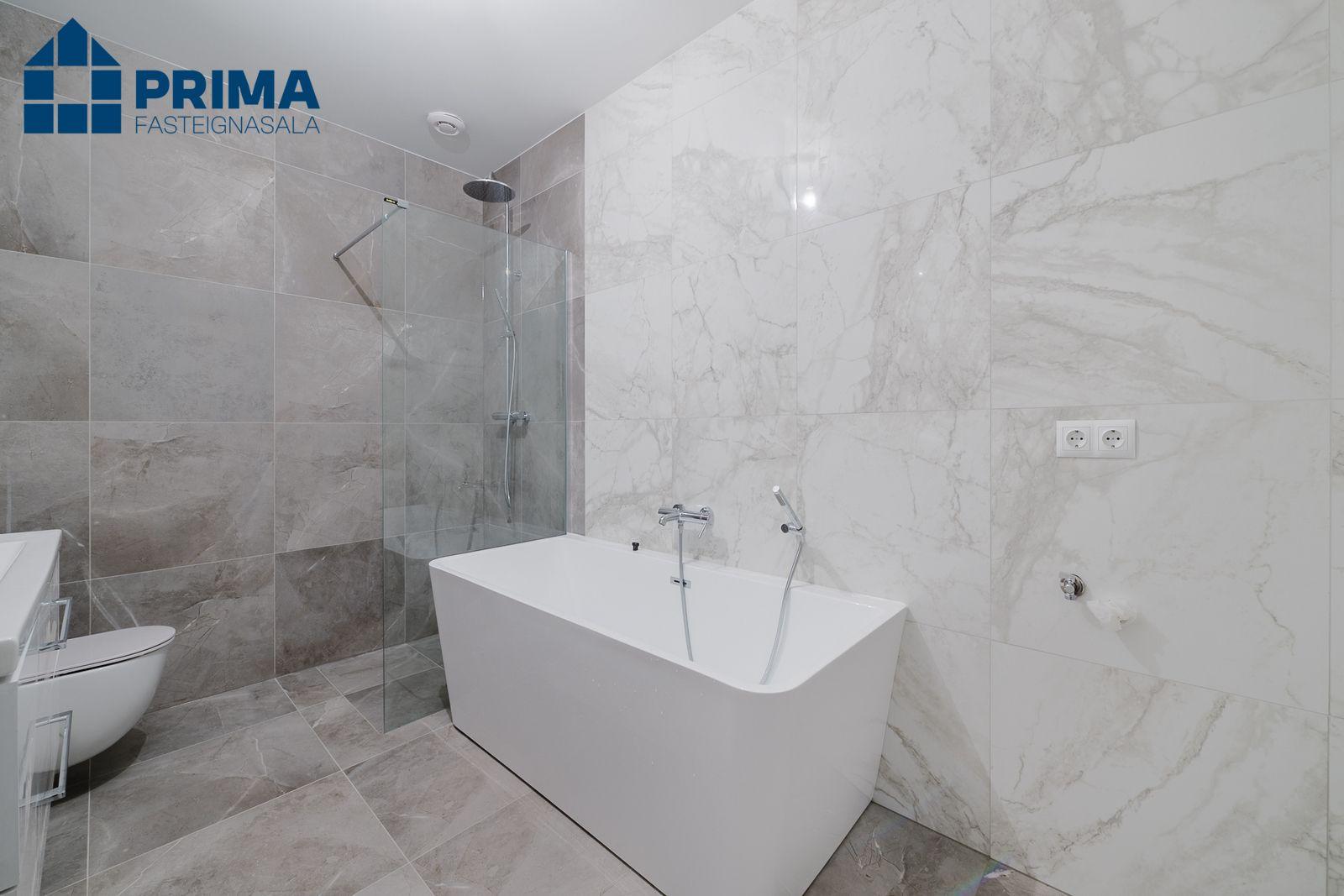 Flísar á baðherbergjum og geymslu eru 60x60 flísar.