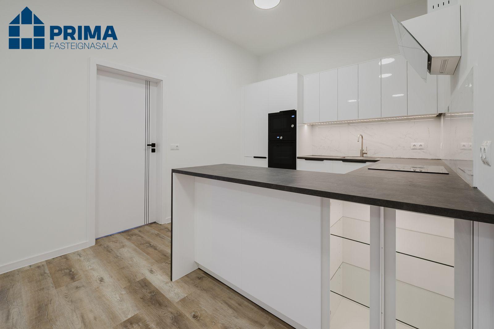Tæki í eldhúsi eru uppþvottavél, ísskápur, ofn, helluborð og örbylgjuofn.