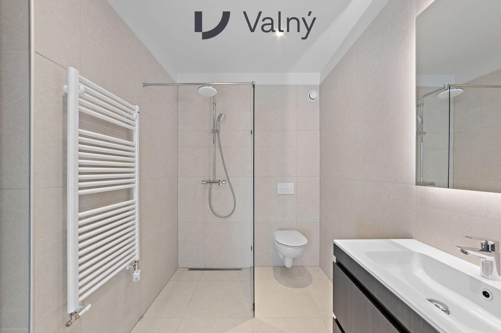 Baðherbergi með innréttingu, upphengdu salerni, handklæðaofni og sturtu með glerskilrúmi. Aðstaða fyrir þvottavél og þurrkara í sérsmíðaðri innréttingu. Gólf og veggir flísalagðir, sturta flísalögð með innfelldu niðurfalli og innfelldri lýsingu. Blöndunartæki Grohe.