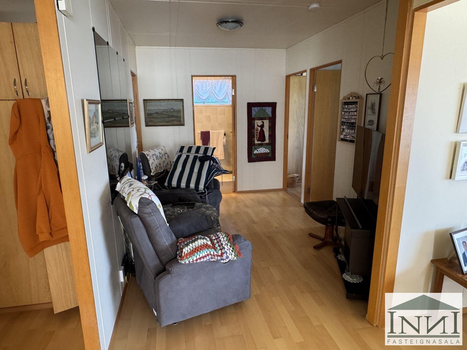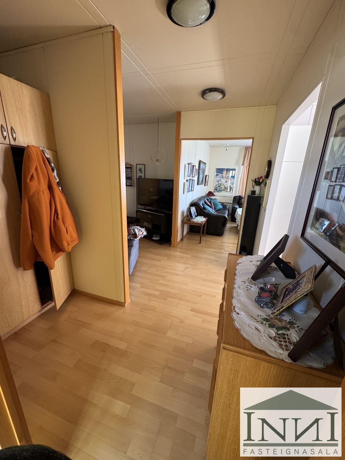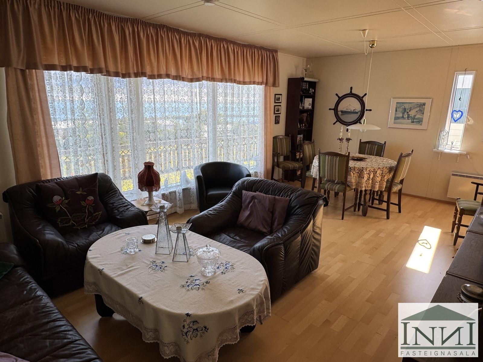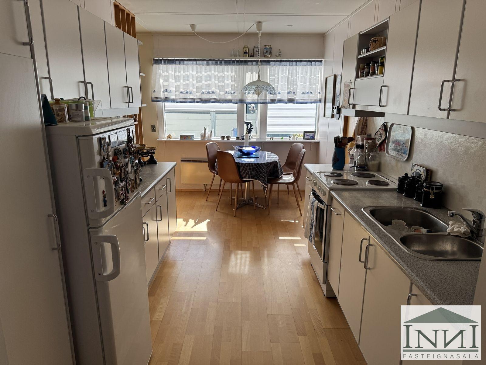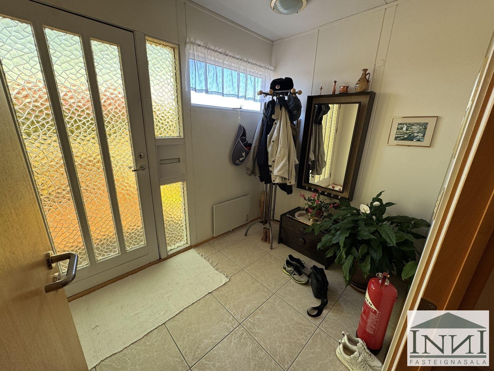 Einbýlishús með þremur svefnherbergjum og bílskúr á Vopnafirði. Gengið er inn í rúmgóða forstofu með flísum á gólfi og þaðan er komið inn á hol. Á holi er fataskápur sem nýtist sem forstofuskápur. Inn af holi er sjónvarpshol og úr því er gengt í flest rými í húsinu. Til hægri er eldhús, beint áfram er stofa og til vinstri er gangur þaðan sem eru þrjú svefnherbergi og baðherbergi. Tvö svefnherbergjanna eru svipað stór með þreföldum fataskápum og svo er hjónaherbergi rúmgott með stórum fataskáp með rennihurðum. Parket er á gólfum. Baðherbergi er með flísum á gólfi og plötum á veggjum, sturtuklefa, snyrtiborði með stórum spegli og lýsingu, salerni, vaski í innréttingu og efri skáp. Stofa og borðstofa eru í björtu rými með stórum gluggum til austurs og er gengt þangað bæði frá holi og eldhúsi. Úr stofu er gengt út í snyrtilegan garð með grindverki. Einnig er pallur sunnan við húsið. Eldhúsinnrétting lítur vel út og hafa framhliðar hennar verið endurnýjaðar. Inn af eldhúsi er þvottahús með máluðu gólfi og þaðan er útgengt. Inn af þvottahúsi er gengt í geymslu sem einnig er með máluðu gólfi, þar er hitakútur og opnanlegt upp á háaloft. Bílskúr er með steyptu gólfi, vaski og rafdrifinni hurð, gluggar snúa niður að sjó. Að utan er húsið timburklætt, þak lítur vel út á húsi en aðeins þreyttara á bílskúr. Skipt hefur verið um járnplötur í þaki, skipt hefur verið um einn glugga í stofu og timbur þar sem þörf var á. Eigninni hefur almennt verið vel við haldið, en nú er kominn tími á að mála það að utan. Snyrtileg eign á fallegum stað á Vopnafirði. Frábært útsýni og nálægð við náttúruna.
