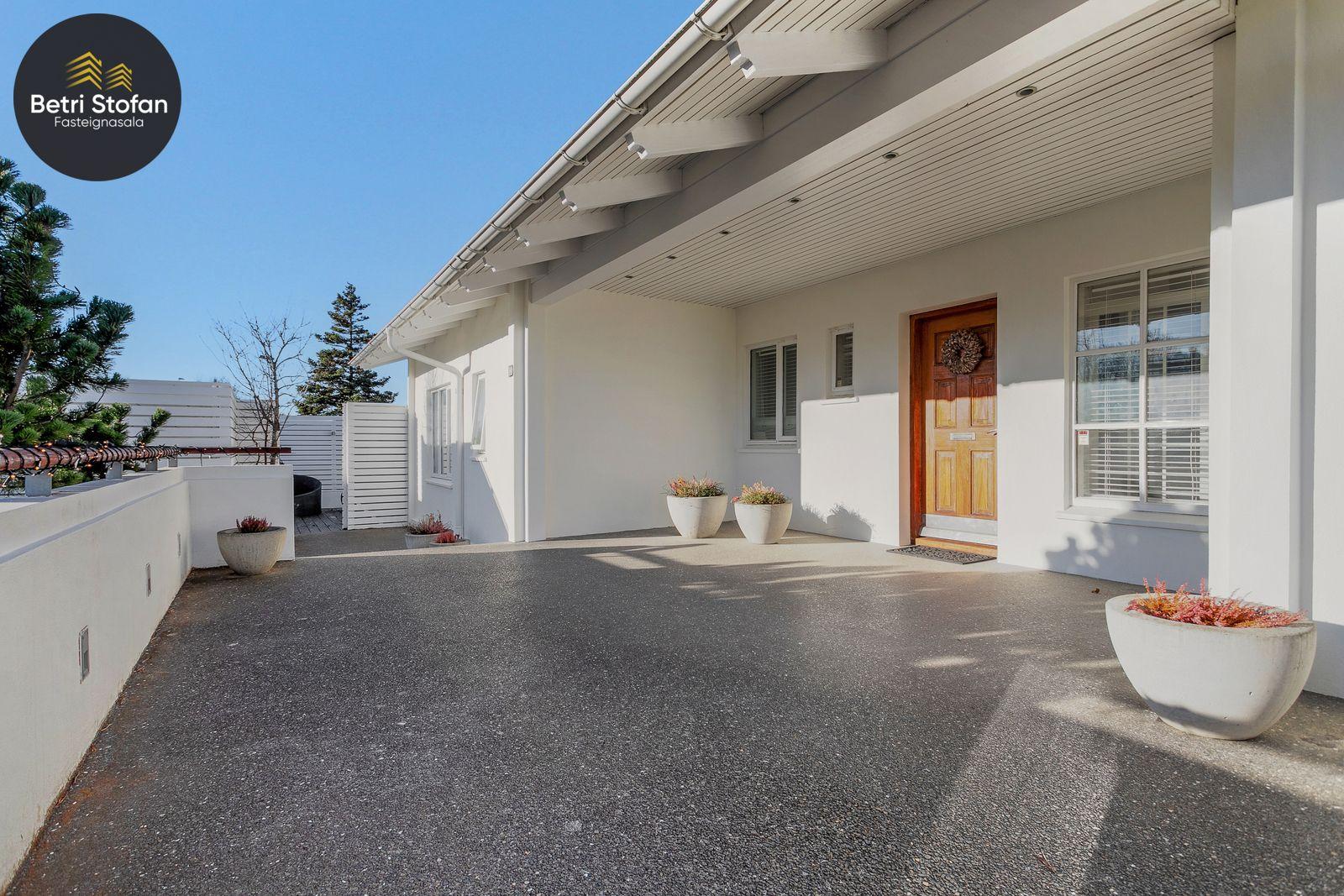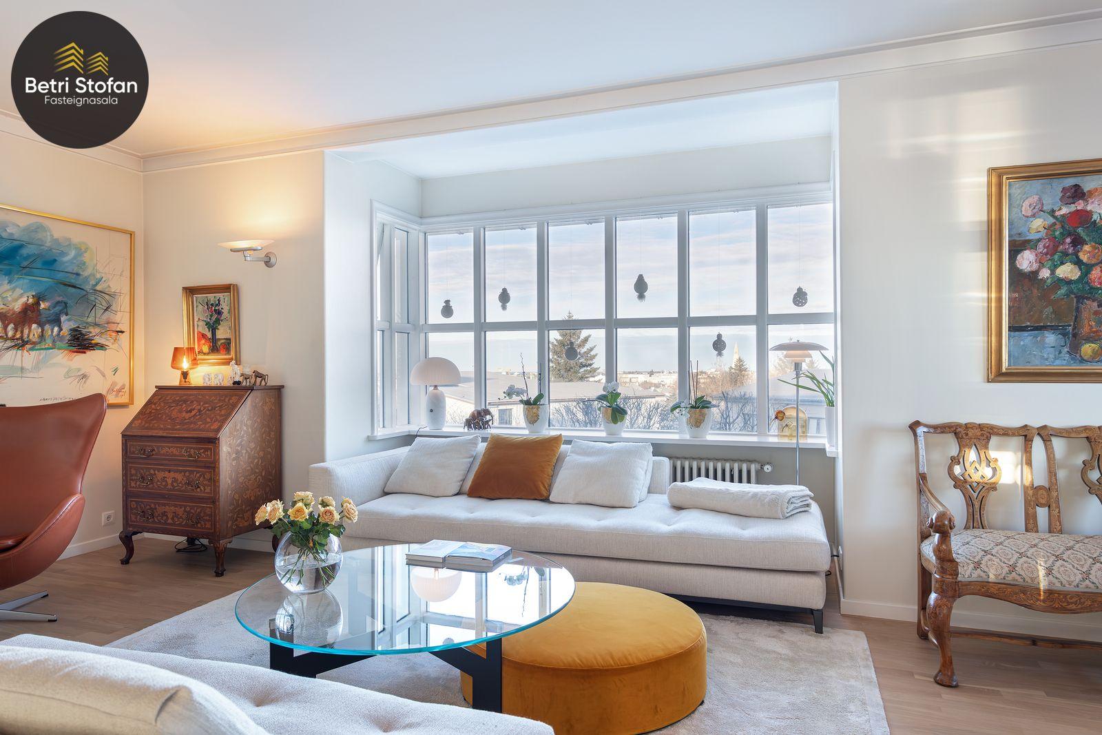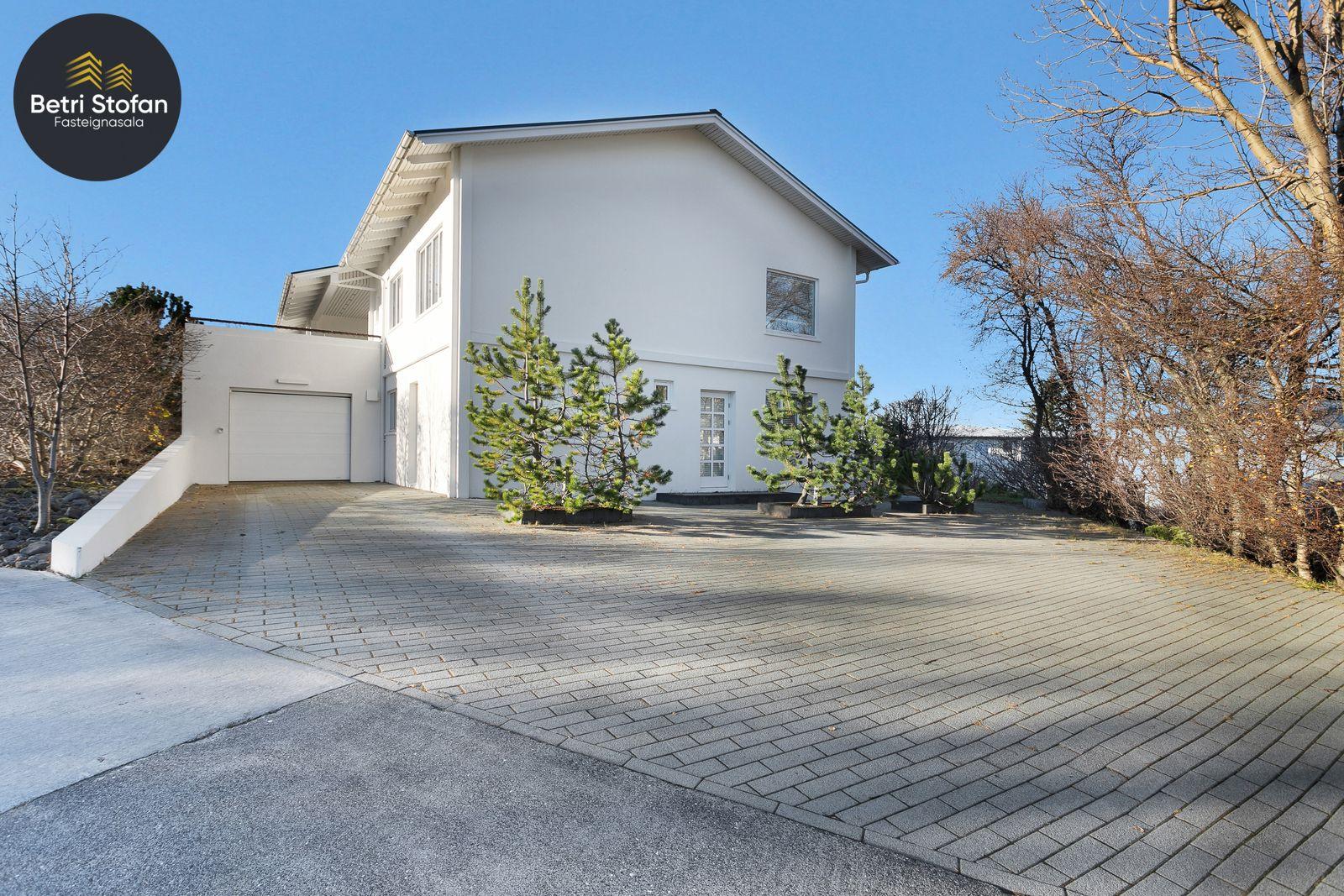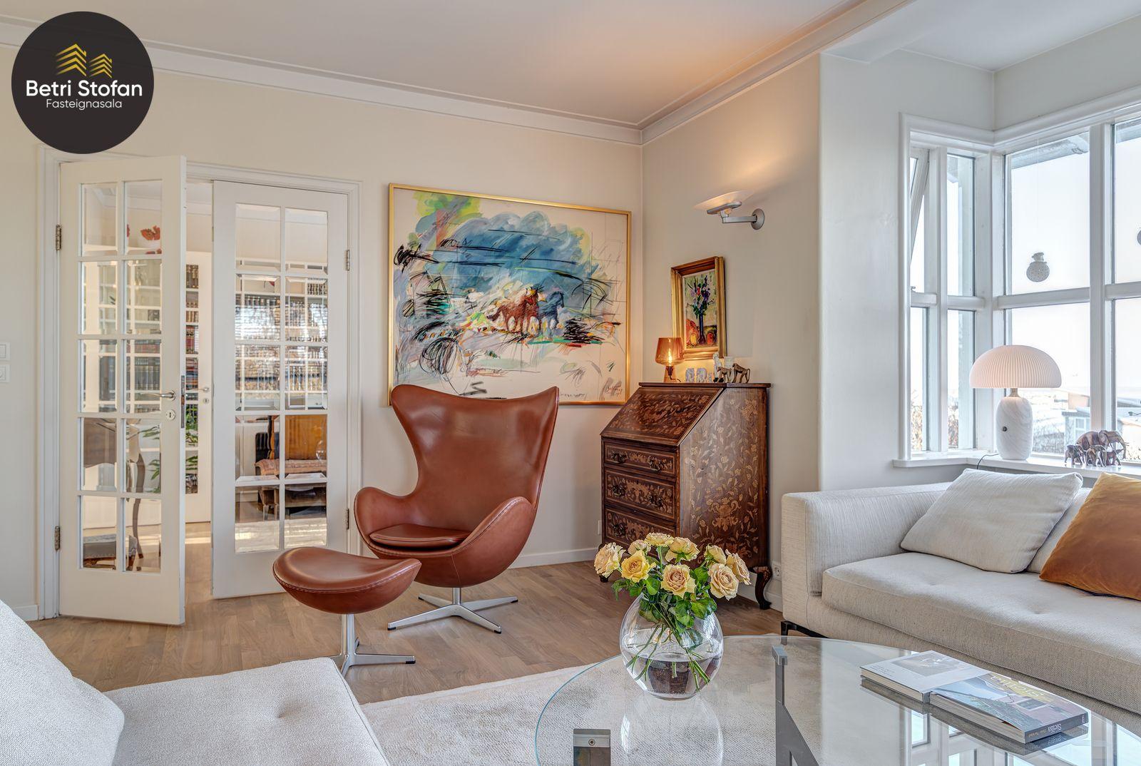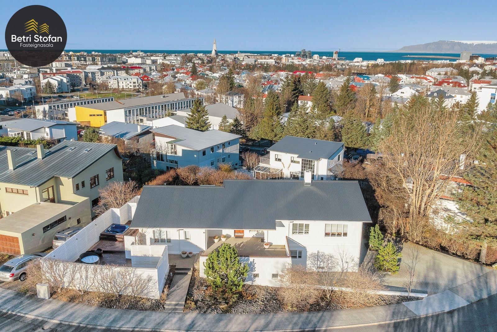 Nánari lýsing: Frá honum er hægt að fara inn um aðalinngang hússins eða beint inn í eldhús. Komið er inn í flísalagða forstofu, en húsið allt er lagt gegnheilu ljósu parketi, utan forstofa, baðherberja og þvottahúss sem eru flísalögð og geymslu og bílskúrs sem eru máluð. Í forstofu er gestasnyrting og fatahengi, en þaðan er farið inn rúmgott hol. Stofan, sjónvarpsherbergið og eldhús sambyggt borðstofu eru björt rými með fallegum gluggum. Arinn er í stofu og úr borðstofunni er útsýni á aðra hönd upp í Öskuhlíð og á hina höndina yfir miðbæ Reykjavíkur, líkt og úr stofunni. Glæsilegt eldhúsinnrétting frá Phoggen Phol er með Miele tækjum. Úr holi er gengið niður tvö þrep inn á svefnherbergisgang, inn í sjónvarpsherbergi/kontór, svo og stofu og eldhús. Á svefnherbergisgangi er stór þakgluggi sem varpar fallegri birtu í rýmið. Frá ganginum er farið inn í tvö rúmgóð svefnherbergi með eldri skápum og einnig inn í stórt hjónaherbergi með nýjum skápum, með einkabaðherbergi innaf, sem er með tvöföldum vaski og baðkari. Frá enda svefnherbergisgangs er gengið út á stóran skjólgóðan sólpall með heitum potti, ásamt heitri og kaldri sturtu. Þaðan er einnig hægt að ganga fram fyrir húsið og aftur fyrir húsið niður í bakgarðinn. Neðri hæð: Úr holi á efri hæð liggur steyptur stigi til neðri hæðar sem er jarðhæð út í garðinn. Komið er inn í rúmgott sjónvarpshol, þar fyrir innan er tómstundaherbergi og innaf því er svefnherbergi og gestasalerni ásamt útgangi til austurs. Úr sjónvarpsholi liggur einnig svefnherbergisgangur með tveimur svefnherbergjum og sameiginlegu baði með tvöföldum vaski og tvöfaldri sturtu. Þá er opið frá sjónvarpsholi inn á gang sem liggur að geymslu og bílskúr, og loks er gengið frá sjónvarpsholi inn í þvottahús, þaðan sem útgengt er í hjólageymslu og út um hurð til suðurs. Bílskúr: Í bílskúr sem er skráður 30,5 fm og er pláss fyrir stóran bíl og 5-6 bílastæði eru aukalega á lóð hússins. Húsið er allt hið glæsilegasta, hefur fengið gott viðhald og verið endurnýjað að nær öllu leyti. Stutt er í skóla, verslanir og miðbærinn í 20 mín göngufæri. Hér er um einstakt tækifæri að ræða, en hús við Háuhlíð hafa löngum gengið í ættir, og koma afar sjaldan á markað.