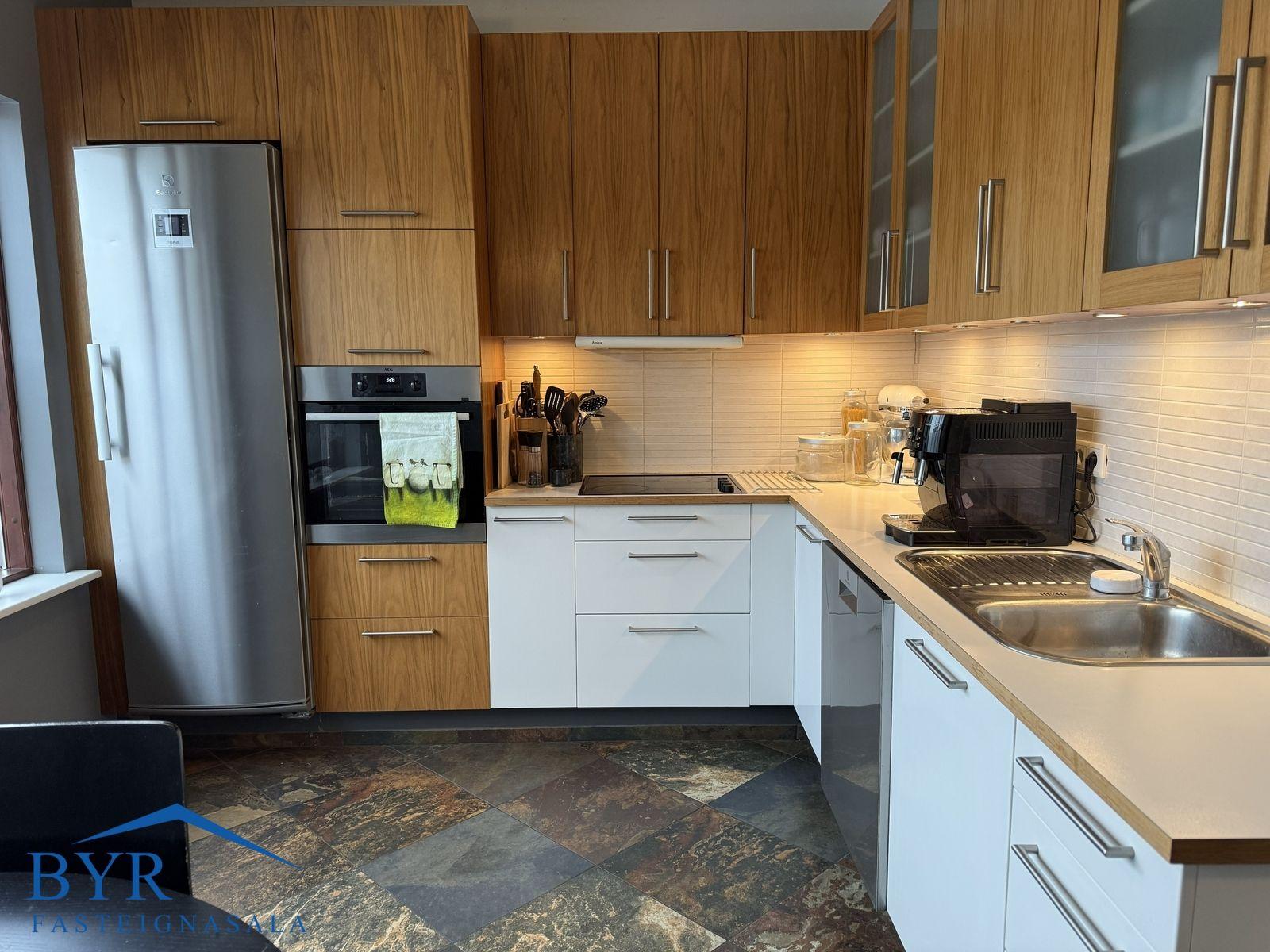 Eldhús, Brúnás innrétting, Electrolux helluborð, Amica vifta og AEG ofn í vinnuhæð, Husqvarna uppþvottavél og Electrolux ísskápur (fylgir bæði), borðkrókur.