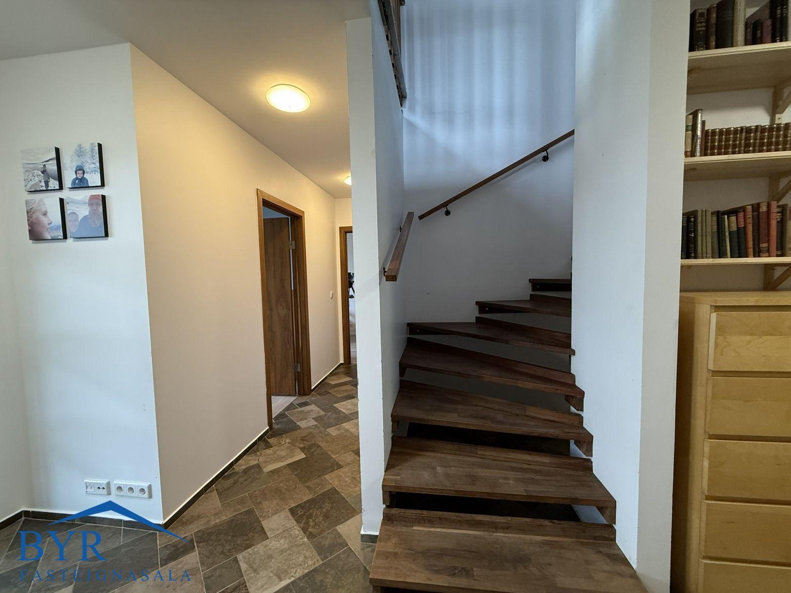 Skáli er neðan við stiga, flísar á gólfi, frá skála er útgengt út í bakgarð á