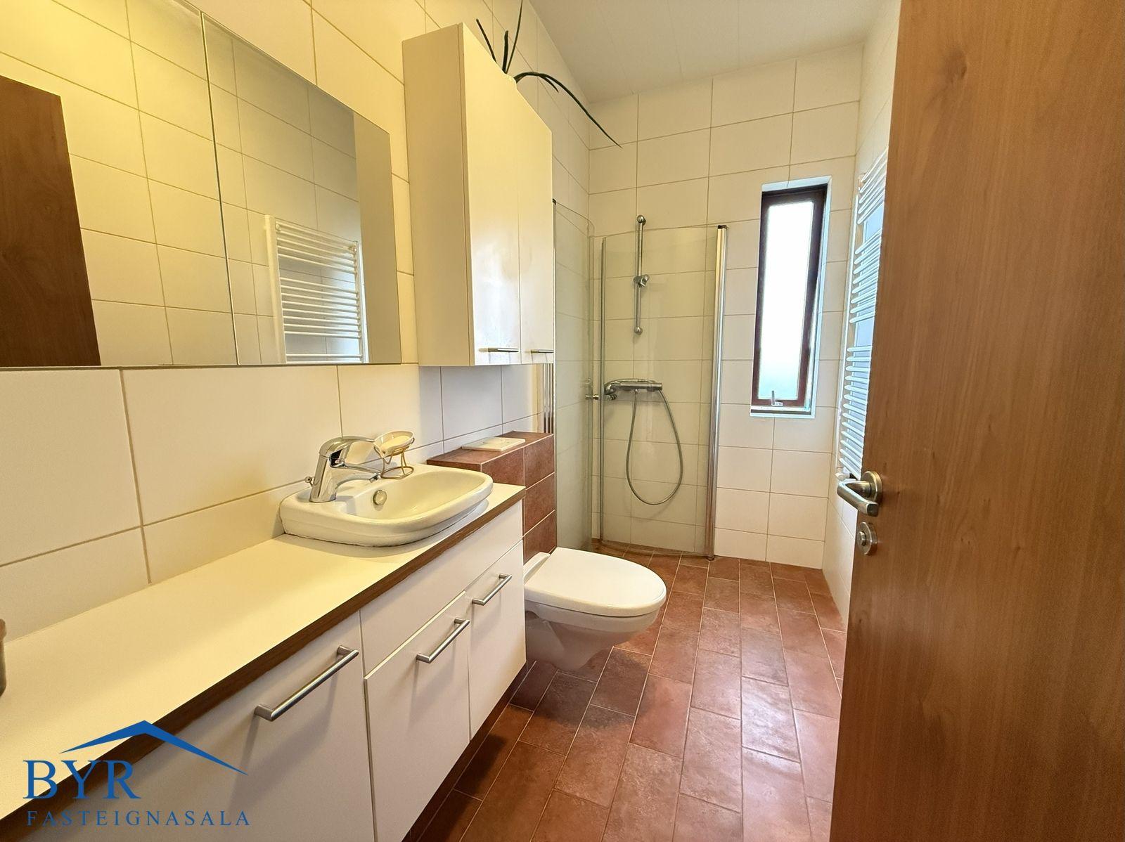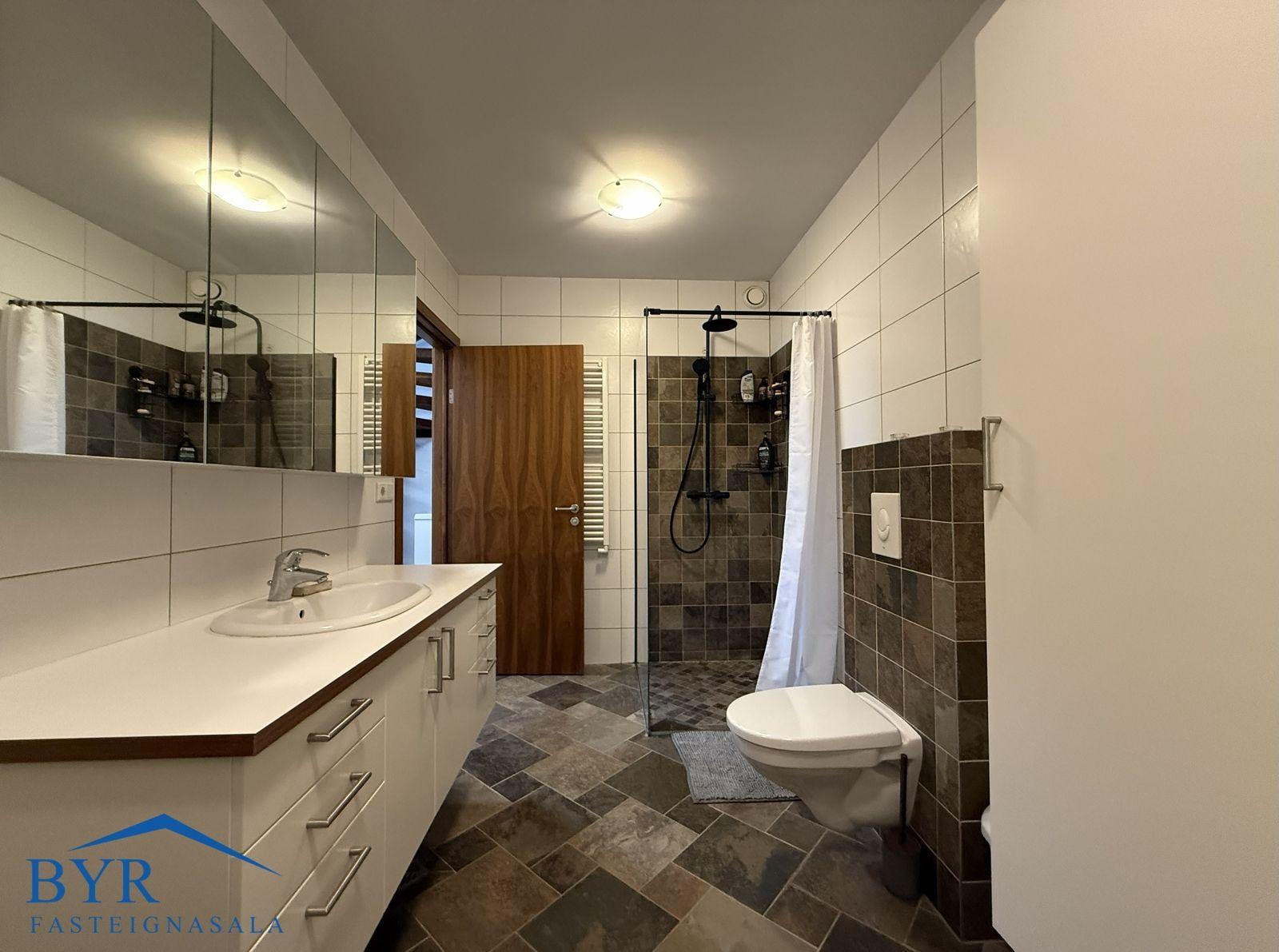 Baðherbergi, flísalagt í hólf og gólf, baðkar, sturta, upphengt salerni og vaskinnrétting, speglaskápar og handklæðaofn, rör fyrir loftun.